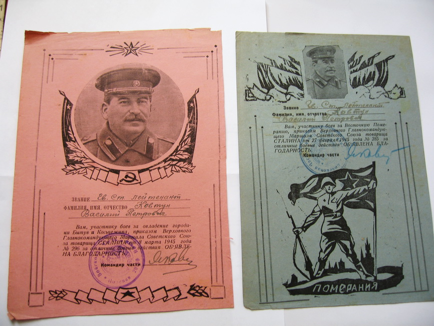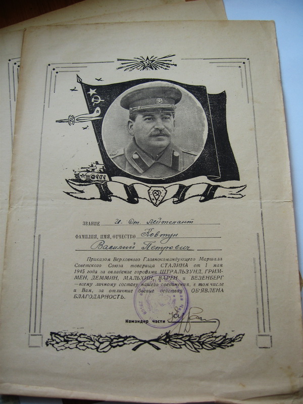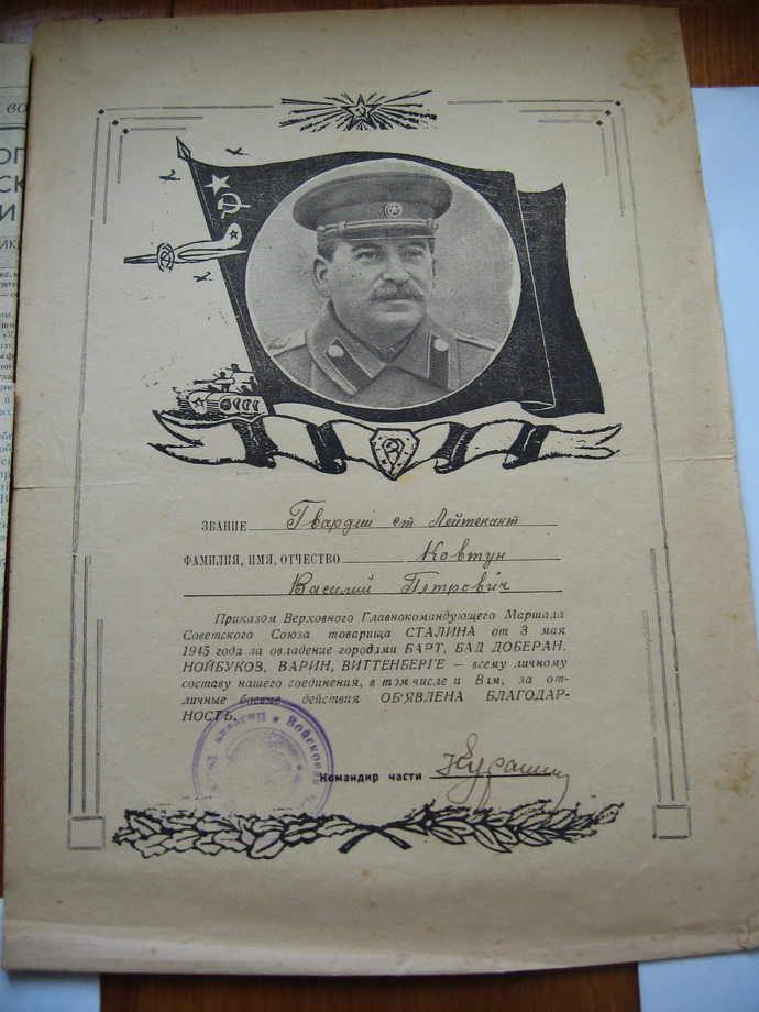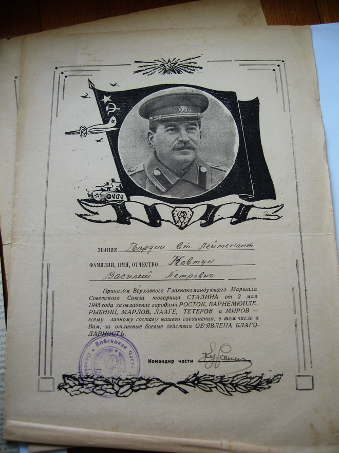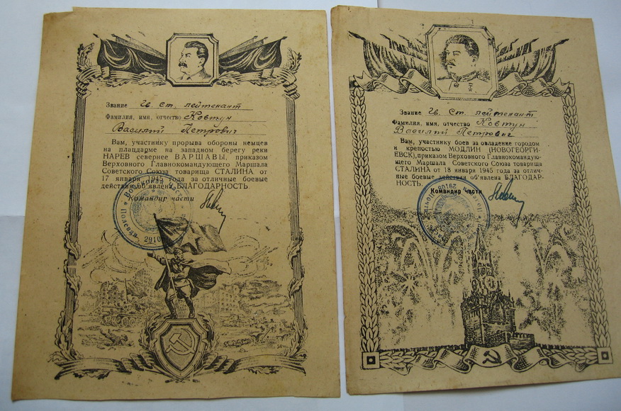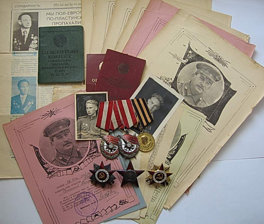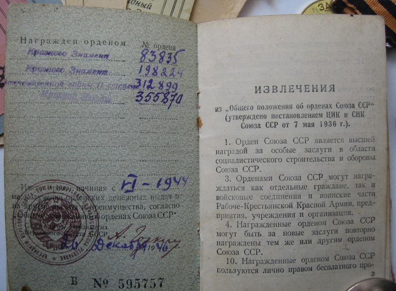 В комплект входят все предметы представленные на фото (больших грамот--6 шт,малых грамот--6 шт). Сохранность на фото. Доставка до Киева--в клуб. -----------------------------------------------------------------Выдержки из наградных листов к орденам БОЕВОГО КРАСНОГО ЗНАМЕНИ:-----------"В ночь на 2 августа т.Ковтун с двумя разведчиками,двумя радистами и двумя телефонистами на лодке под обстрелом пулеметов и минометов противника переправился через реку ВИСЛА на остров.... Высадившись на остров группа возглавляемая т. Ковтун....почти в упор расстреляла до десяти автоматчиков,захватила у них документы и закрепилась на берегу.Вскоре последовала контратака противника,который превосходящими силами с криком бросился против смельчаков,с целью окружить и уничтожить их. Тов. Ковтун быстро связавшись с артилерией на восточном берегу реки сигналом электрофонаря дал целеуказание батареи,а сам с группой смельчаков,подпуская гитлеровцев на расстояние броска гранаты,почти в упор расстреливал немецких солдат и забрасывал их гранатами. .....контратака была отбита,противник оставил на поле боя до 50 трупов. В этот день противник 6 раз переходил в контратаку,но мужественная семерка возглавляемая т.Ковтун,.......отбросила контратаки врага и прочно закрепилась на острове.........в этом бою т.Ковтун лично уничтожил 10 фашистских солдат,а вся группа возглавляемая им расстреляла свыше 60 немецких солдат и 2 офицера. .....В течении 4 суток почти без сна и отдыха наблюдал за противником и корректировал огонь артдивизиона....------------------------------------------------------------------------------------------------------------------------------За время нахождения в тылу врага с 14 по 28 января 1944г умело организовывал разведку сил противника. В селе АЛЕКСАНДРОВКА по его инициативе была организована погоня за разведкой противника в составе 5 человек....был захвачен командир этой группы ,а остальные уничтожены. .....разведав расположение сил противника, выяснил безопасный путь движения дивизиона из окружения........