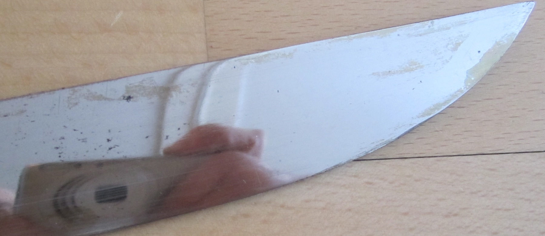 Klinok ne sovsem do kontsa zahodit v nozhny, chuvstvuetsja, chto mozhno i glubzhe zasunut, no ja ne hochu siloi ego vpihivat, vidimo v nozhah nakopilos grjazi ili chego-to, dumaju, legko pochistit.