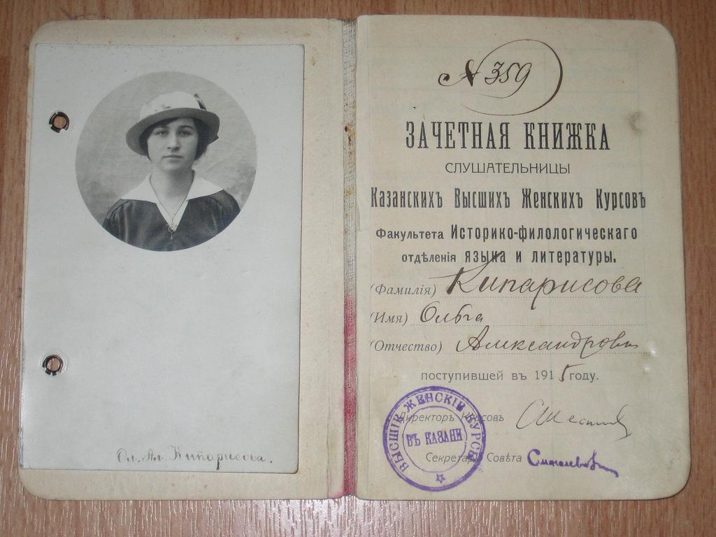Зачетная книжка Казанских Высших Женских Курсов. 1915 год.