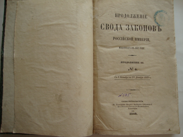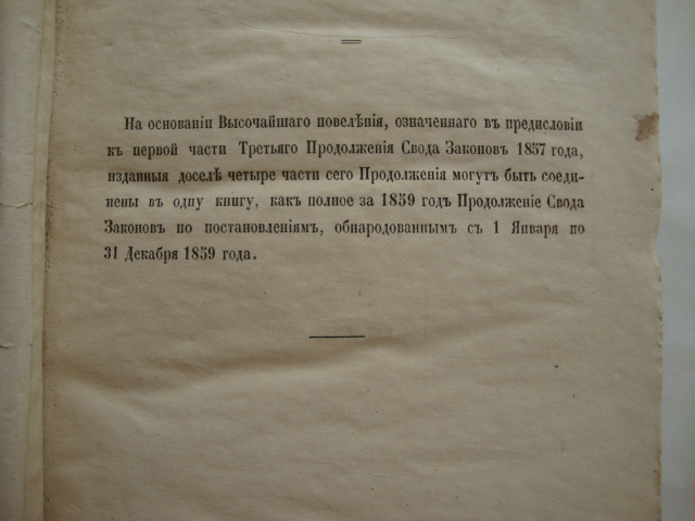 Продолжение Свода Законов Российской Империи. (Изданного в 1857году). Типография Второго Отд. Собственной Его Императорского Величества Канцелярии. Изд.1860г. 265 стр.