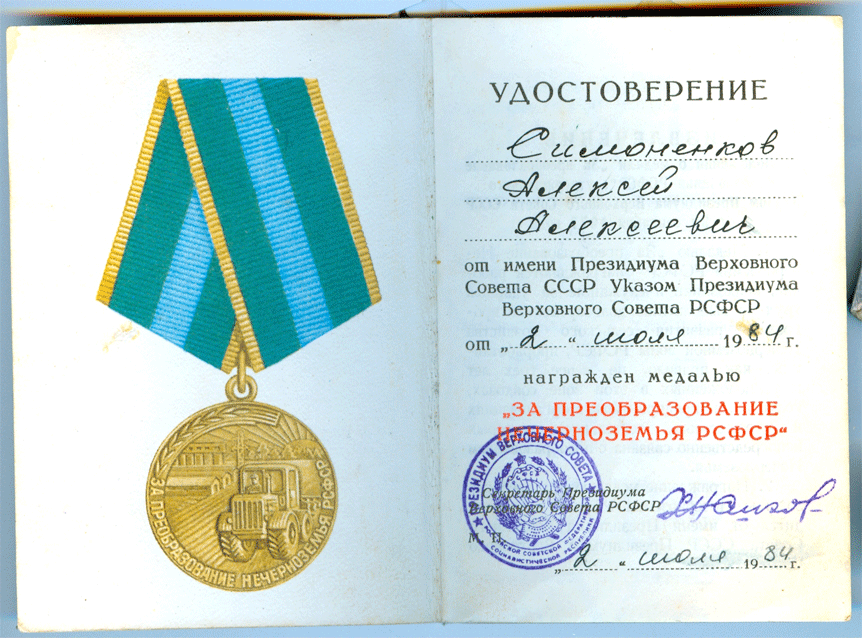 Медали Серп и Молот, За Трудовую Доблесть, За Трудовое Отличие, За Доблестный Труд в Великой Отечественной Войне,За Восстановление Предприятий Чёрной Металлургии Юга, За Восстановление Угольных Шахт Донбасса, За Освоение Целинных Земель, За Строительство БАМ, За Преобразование Нечерноземья РСФСР, За Освоение Недр и Развитие Нефтегазового Комплекса Западной Сибири, Ветеран Труда