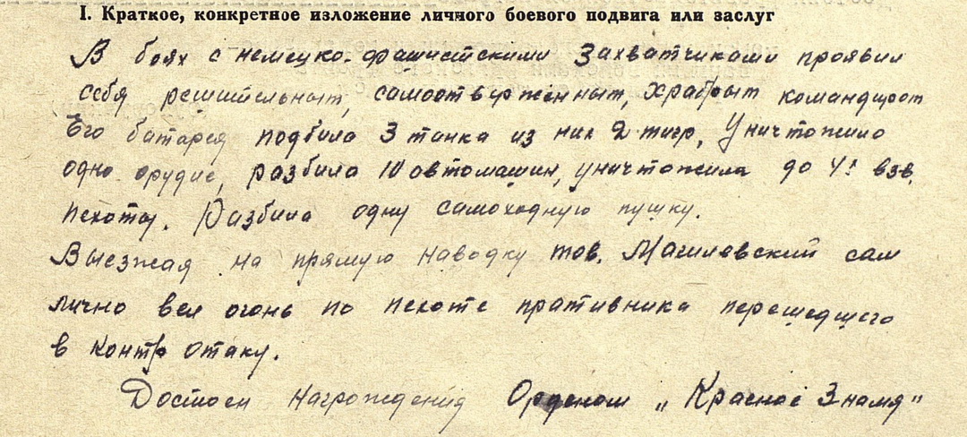 Кавалер: Магилевский Андрей Петрович (1919 г.р.) – командир 1-й батареи Артдивизиона 1-й отдельной мотострелковой бригады 1-го гвардейского Донского Танкового корпуса.Командир артдивизиона представлял кавалера к Ордену «Красного Знамени», ходатайствовали командир мотострелковой бригады, командир Донского Танкового корпуса и командующий Бронетанковыми и механизированными войсками Брянского фронта. Но Приказом Войскам 3-й Армии от 2.09.1943 г. был награжден Орденом Отечественной войны 2 степени.