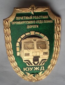 Почётный работник Оренбургского отделения ЮУЖД, бронза, эмаль, размер 31х46мм.