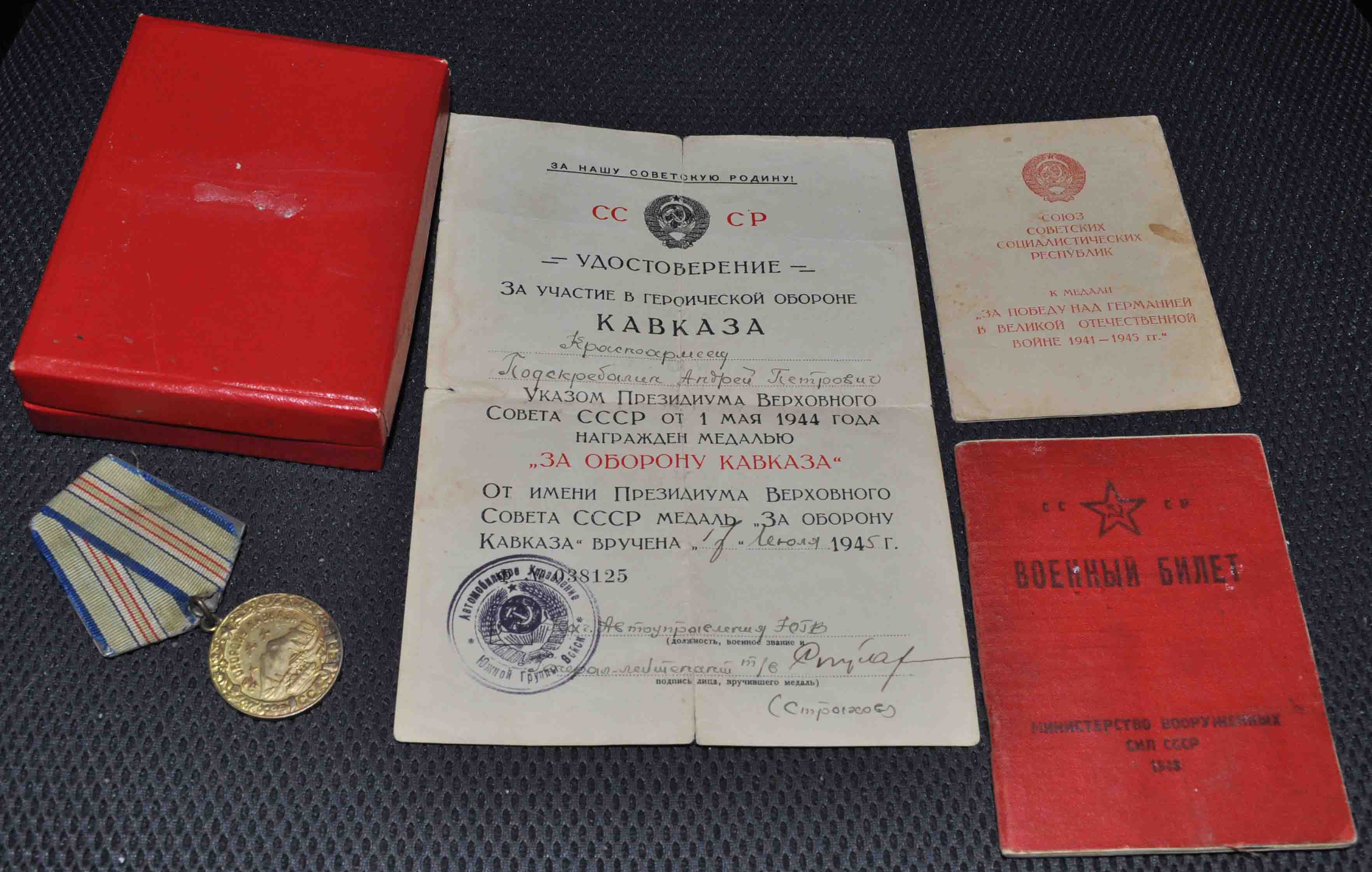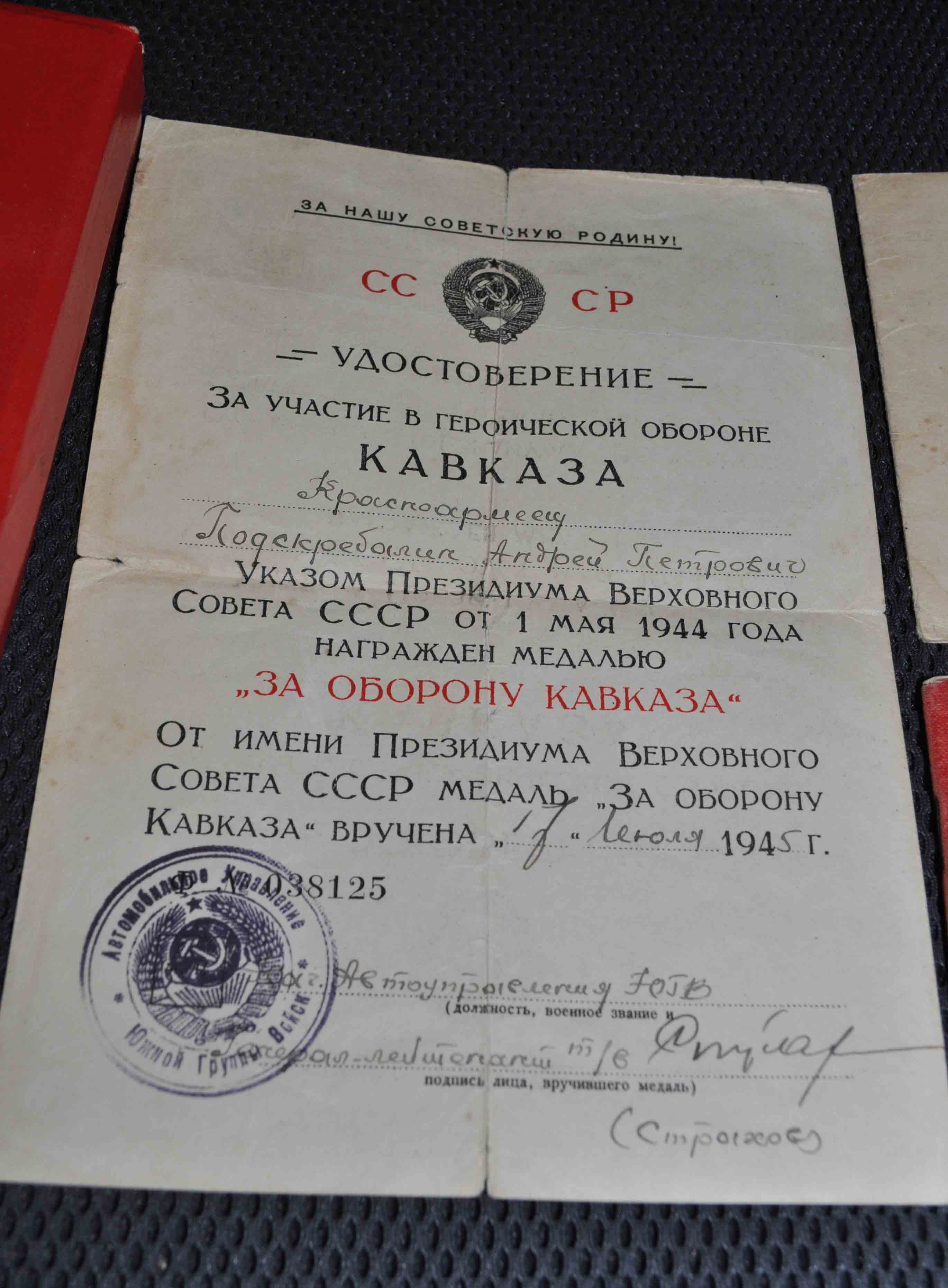 Кавалер проходил срочную службу с 26 по 29гг. был мобилизован в июле 1941г. на доке за кавказ подпись-генерал-лейтенанта танковых войск
