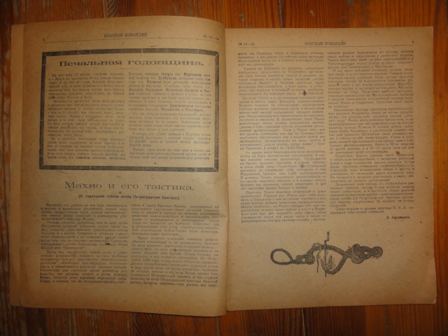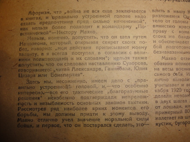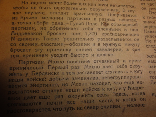 Махно и его тактика (К годовщине гибели штаба Петроградской бригады - на хуторе Левуцком был зверски перебит штаб бригады Петроградских курсантов, направленных против Врангеля и Махно) -дается высокая оценка врагу.