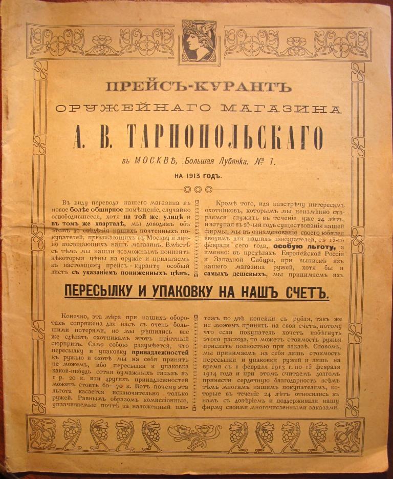 Прейскурант оруж. магазина А. В. Тарнопольского Alex56 - 09 июн 2013 15:20.52 × Мини профиль пользователя Alex56 Сообщения: 784 Зарегистрирован: 25 мар 2006 21:56.39 Статус: Не в сети - 09 июн 2013 15:20.52 #4280877 Прейскурант оружейного магазина А. В. Тарнопольского на 1913 г. 42 листа.Предложите... Фото С уважением, Алексей.