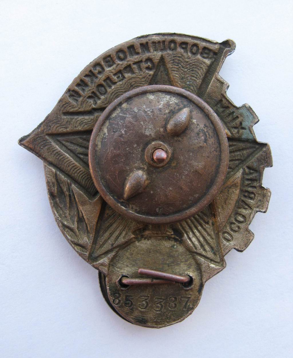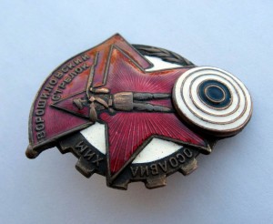 Ворошиловский стрелок, 1-й тип - 1932-1934 гг. Размер 42 х 50 мм. Накладная мишень. Винт крепится на пятке. Красивый, большой знак. Отличное состояние! Немного погнут винт, резьба в порядке, гайка родная, не проскальзывает.