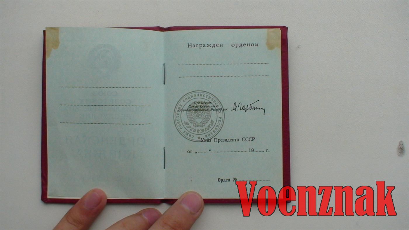 Пустая незаполненная орденская книжка с подписью Горбачева в должности президента. Имеется небольшой дефект: верхние уголки всех страниц залиты водой.