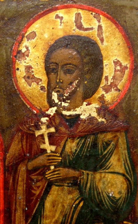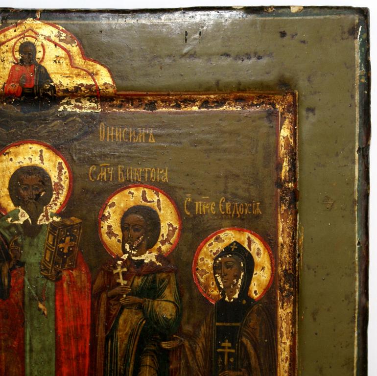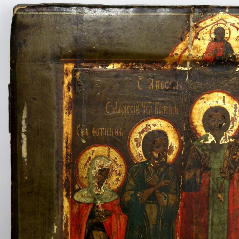 Икона "Святые мученица Фотиния, преподобный Алексий Человек Божий, мученик Виктор, апостол Онисим и преподобномученица Евдокия". Ковчег. Дерево. Левкас. Размер 35,5 х 30,6 х 3,5см.