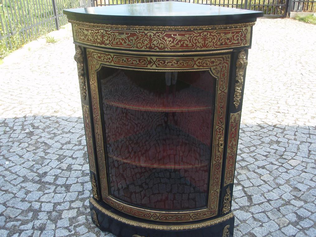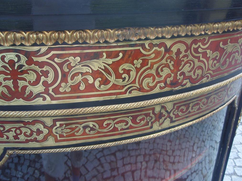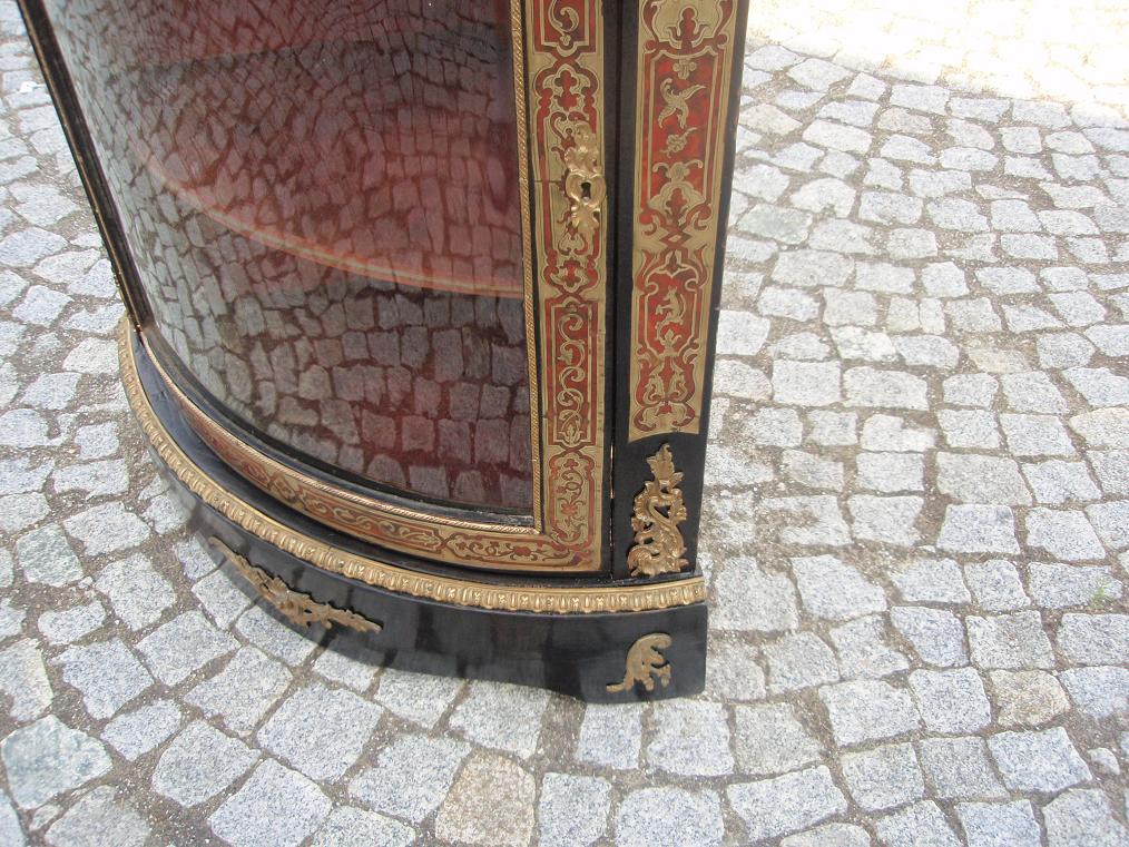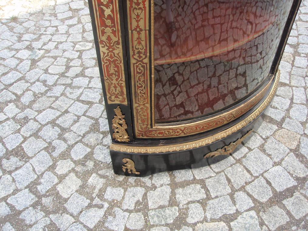 Размеры витрины 112х81х57см. С правой стороны вверху не хватает 8см листвы(см.на фото). Пару элементов интарсии и лака доделаны. Предмет в хорошем состоянии, конечно, видны следы пользования. На апликациях не плохо сохранилась позолота. Цена 3 750 долларов.