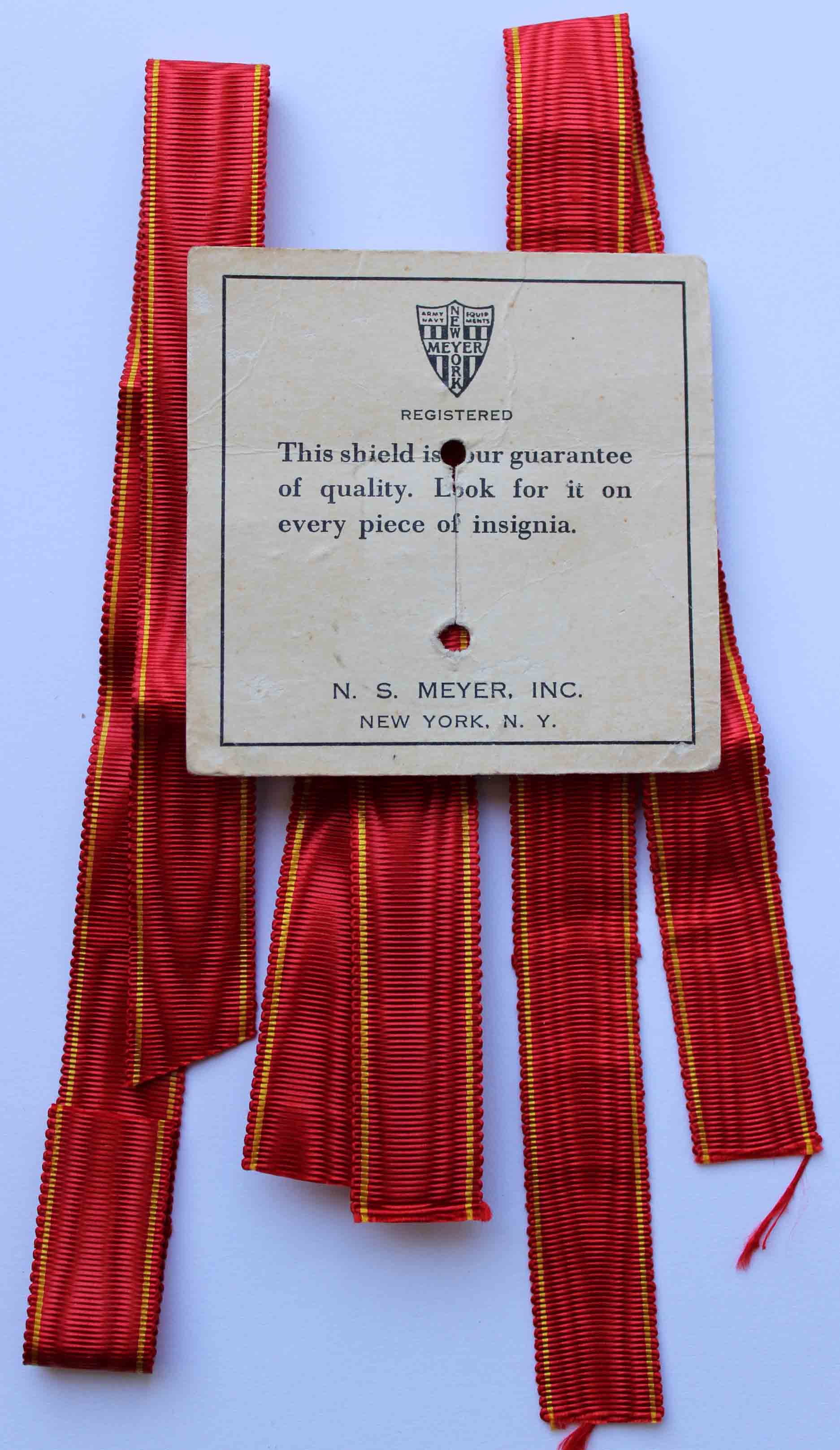 Три ленты (32+32+23 мм), изготовленные во Франции для американской фирмы N.S. Meyer (закрылась в 50-х гг. ХХ в.), и фирменная этикетка.