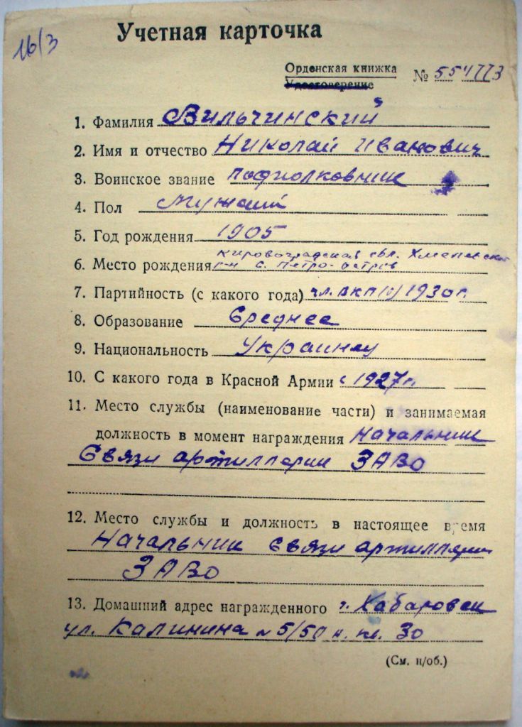 Вильчинский Н. И. Нач. связи артиллерии ЗАВО
