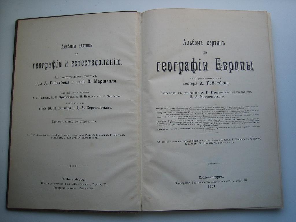 Альбом картин по географии Европы. СПб, Тип. т-ва "Просвещение", 1904 год. С 233 резанными на дереве рисунками. В родном изд. переплете.