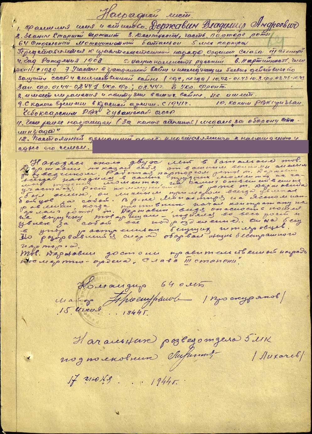 Старший сержант, парторг, разведчик. Увлёк за собой бойцов, спасая фланг роты от контратаки гитлеровцев.