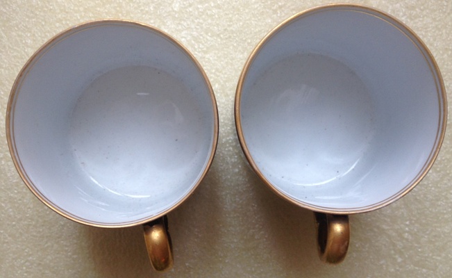 Приветствую!Предложение по Украине,тонкостенный фарфор,размеры:высота-53мм,диаметр-53мм.Из недостатков-на одной из чашек одна внутренняя микротрещина (показал на фото)