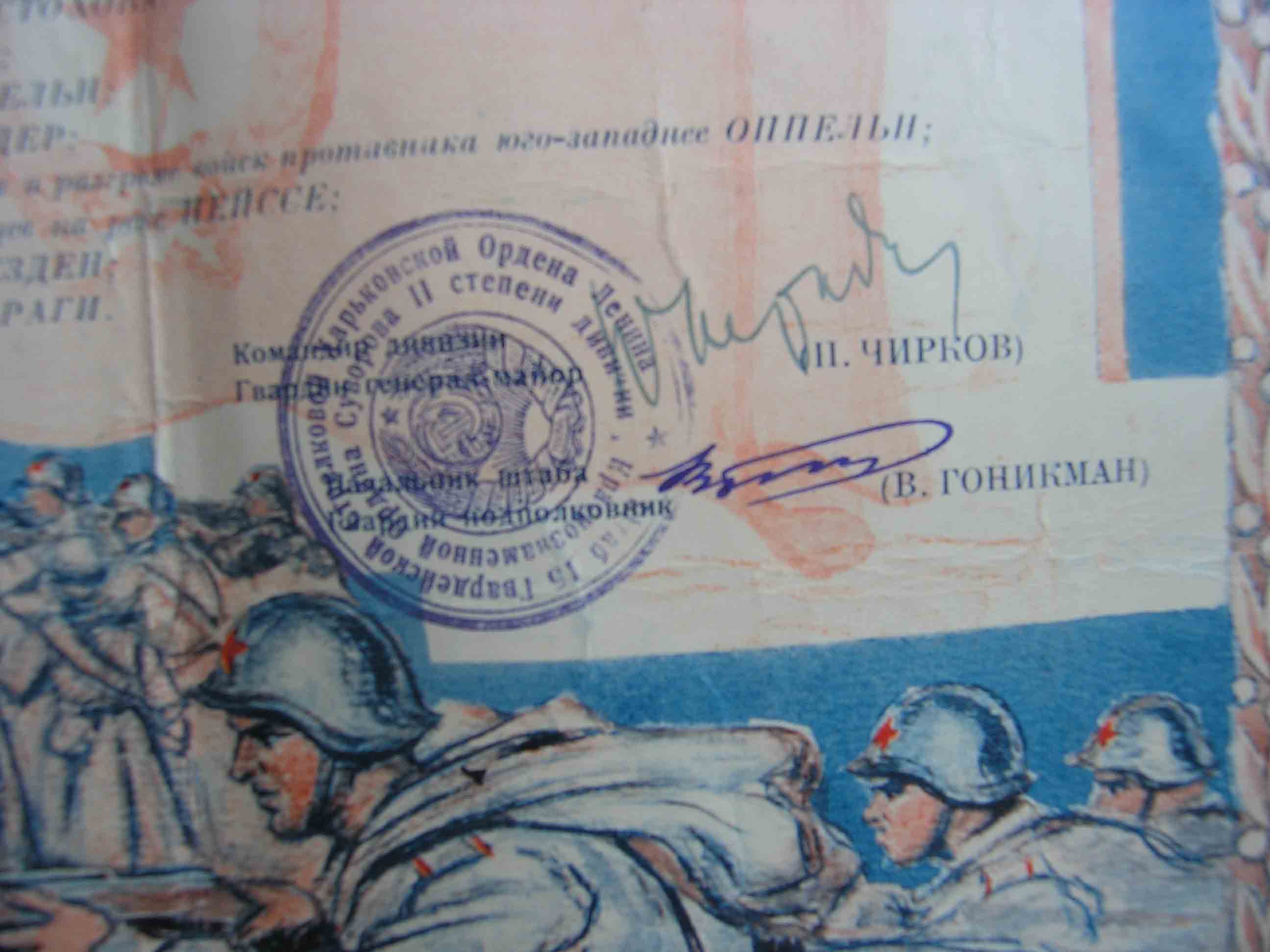 Внизу стоят подписи командира дивизии гвардии генерал-майора П.Чиркова и начальника штаба гвардии подполковника В.Гоникмана