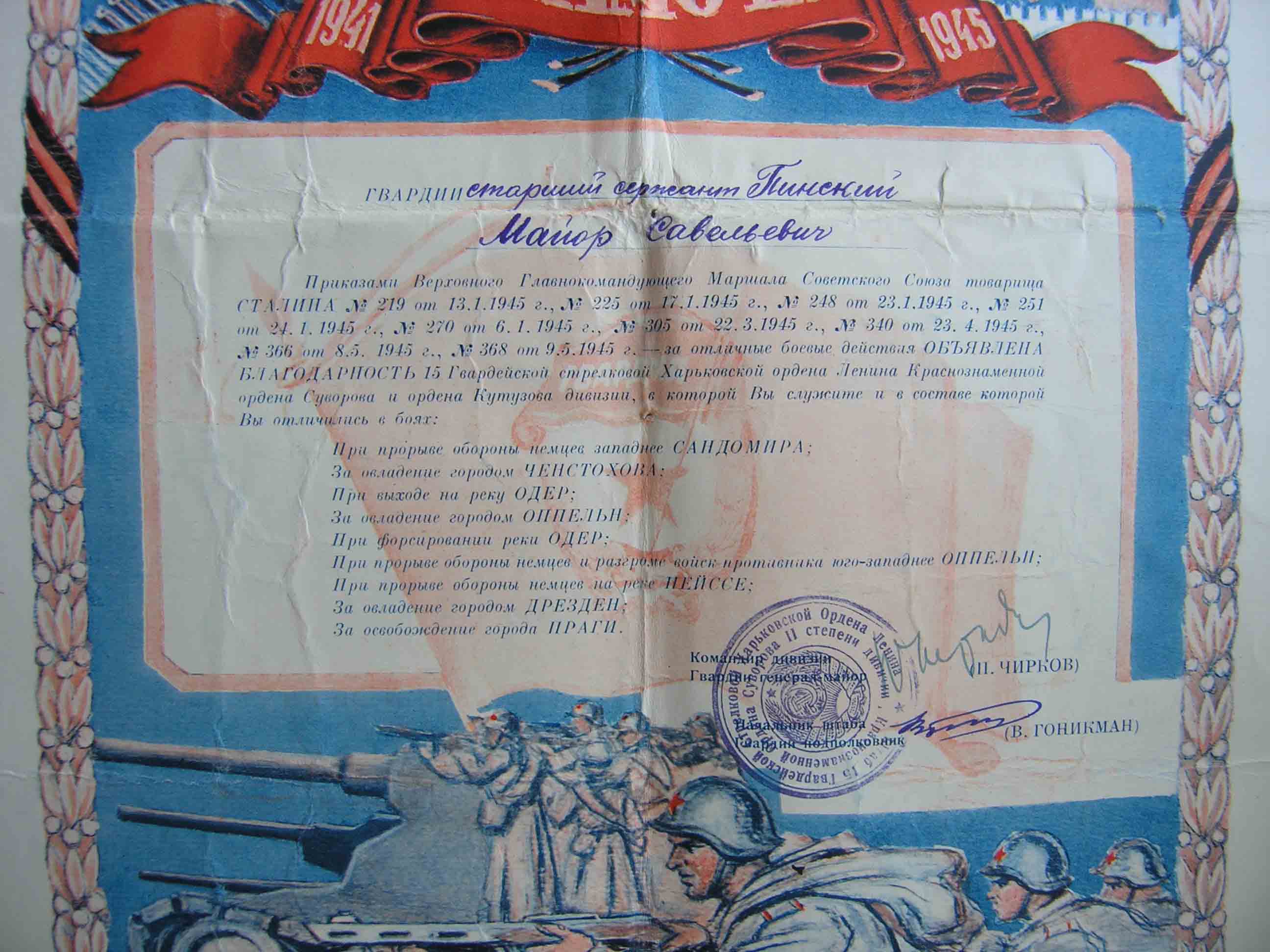 Благодарность 15 гвардейской стрелковой Харьковской ордена Ленина Краснознаменной ордена Кутузова и Суворова дивизии