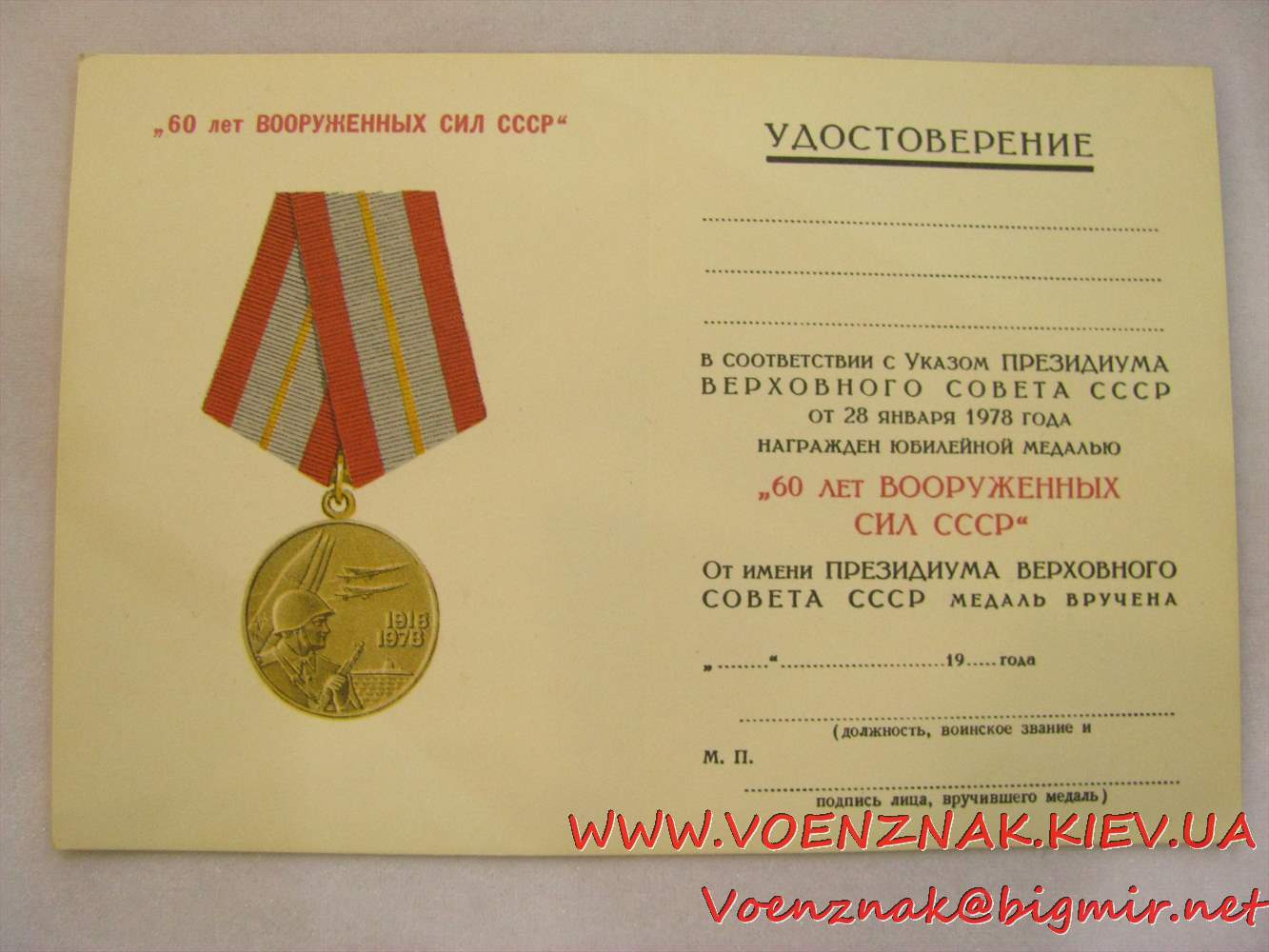 Пустое незаполненное удостоверение к юбилейной медали "60 лет ВС СССР"