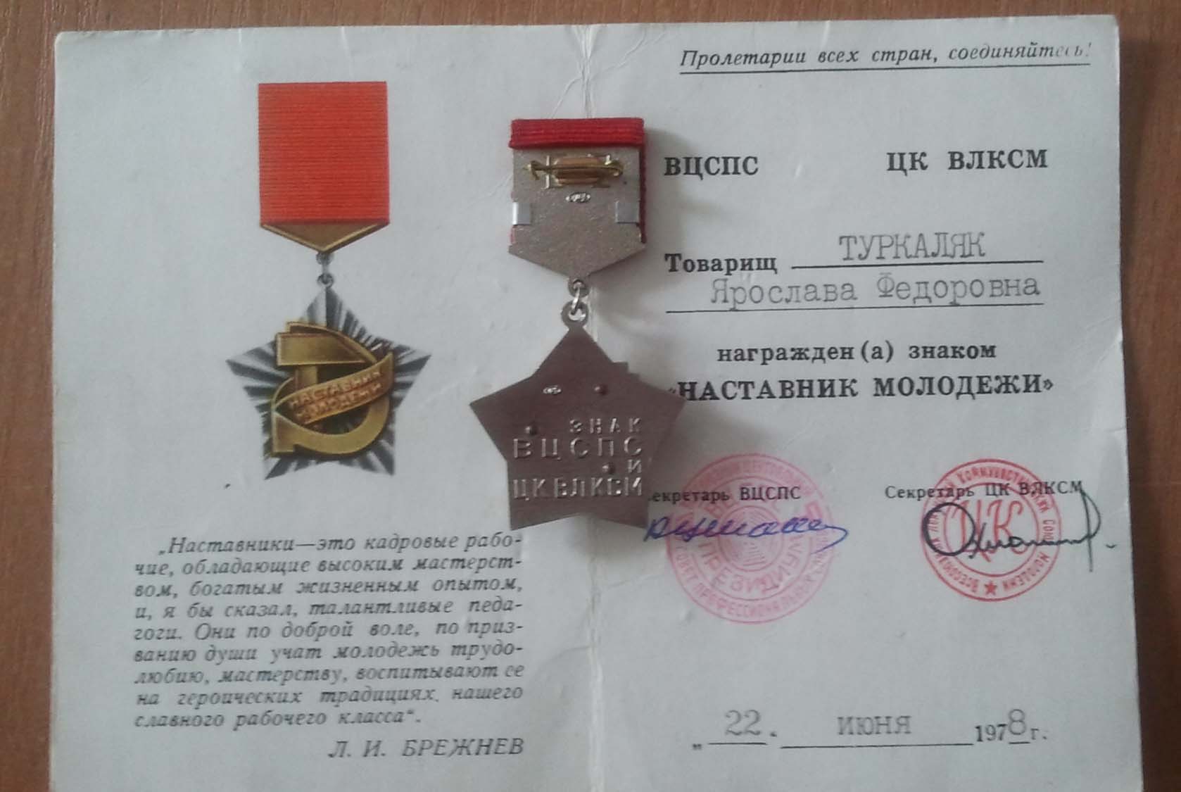 Наставник молодежи с удостоверением ВЛКСМ ВЦСПС