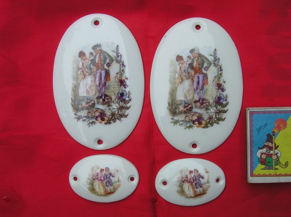 Набор накладок фарфоровых 4шт. на мебель и т.п.,фарфор глазурированный,деколь,дореволюционные,размер:большие-7 на 10см.,маленькие:3,5 на 5,5см.,по Украине,цена фиксированная:250$.Мой адрес alexander7566@ukr.net