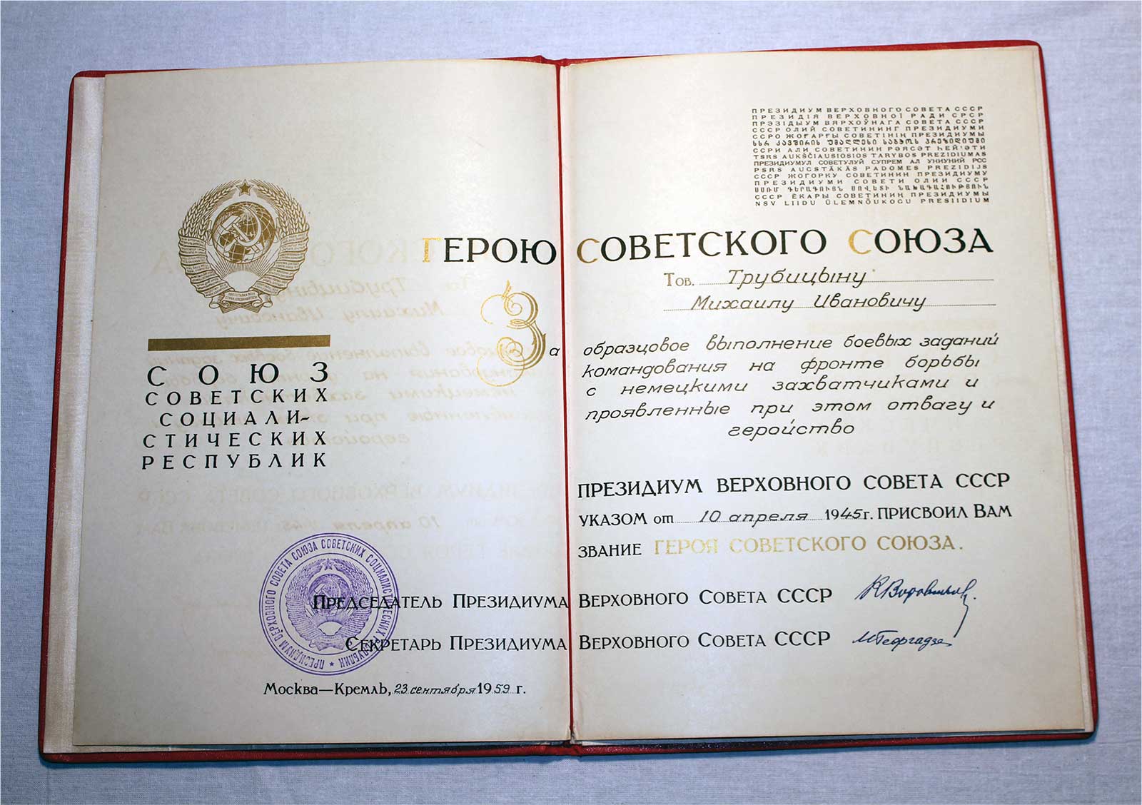 Указом Президиума Верховного Совета СССР от 10 апреля 1945 года за образцовое выполнение боевых заданий командования на фронте борьбы с немецко-фашистскими захватчиками и проявленные при этом мужество и героизм гвардии капитану Трубицыну Михаилу Ивановичу присвоено звание Героя Советского Союза с вручением ордена Ленина и медали «Золотая Звезда» (№ 6017).