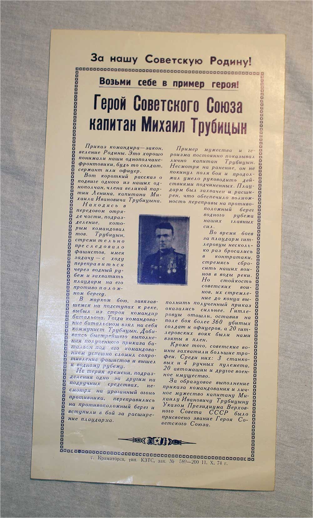 Вот короткий рассказ о подвиге одного из наших однополчан, члена Великой партии Ленина, капитана – Михаила Ивановича Трубицына.