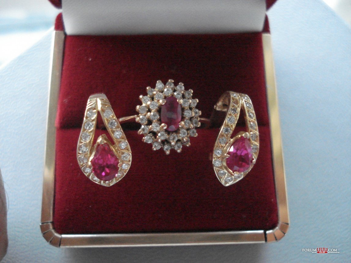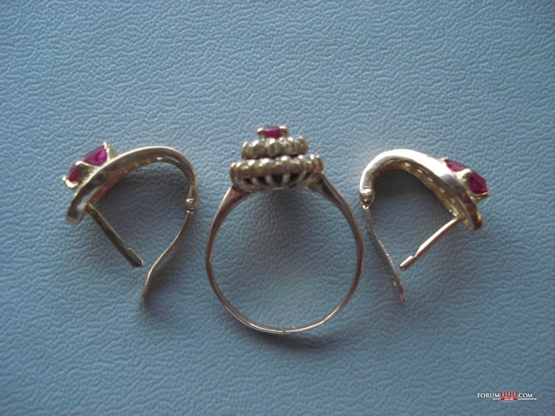 Кольцо и серьги 750 проба, скорее всего какие нибудь арабы. Поставлены Российские клейма: серьги 750, кольцо 585 ( Из предосторожности, видимо, 750 реактив держит) Рубины - корунды по 0.24 ct. Вокруг - цирконы. Кольцо 3.04 гр. Серьги 3.64.гр. Кольцо - 16.5 р-р. 7500р.