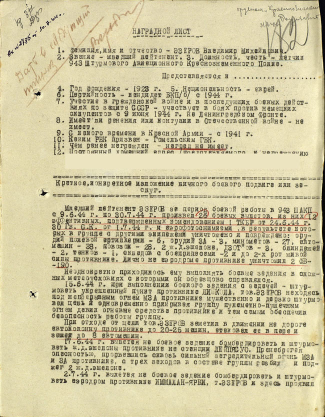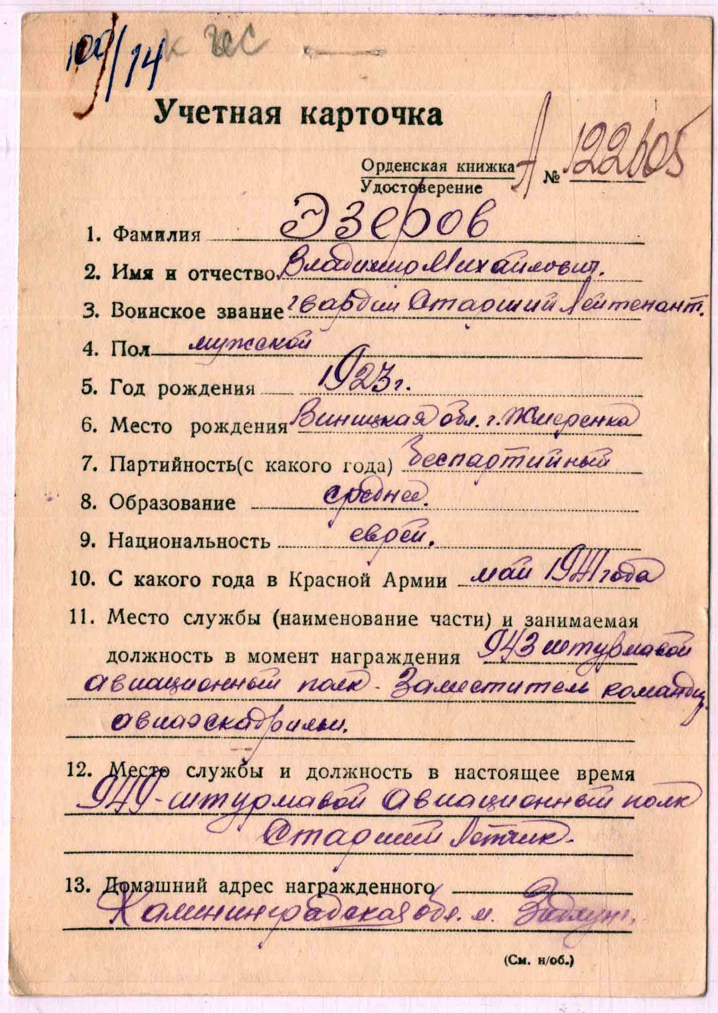 ЭЗЕРОВ Владимир Михайлович-летчик 943 штурмового авиаполка,ст.лейтенант, 1923г.р.,еврей.