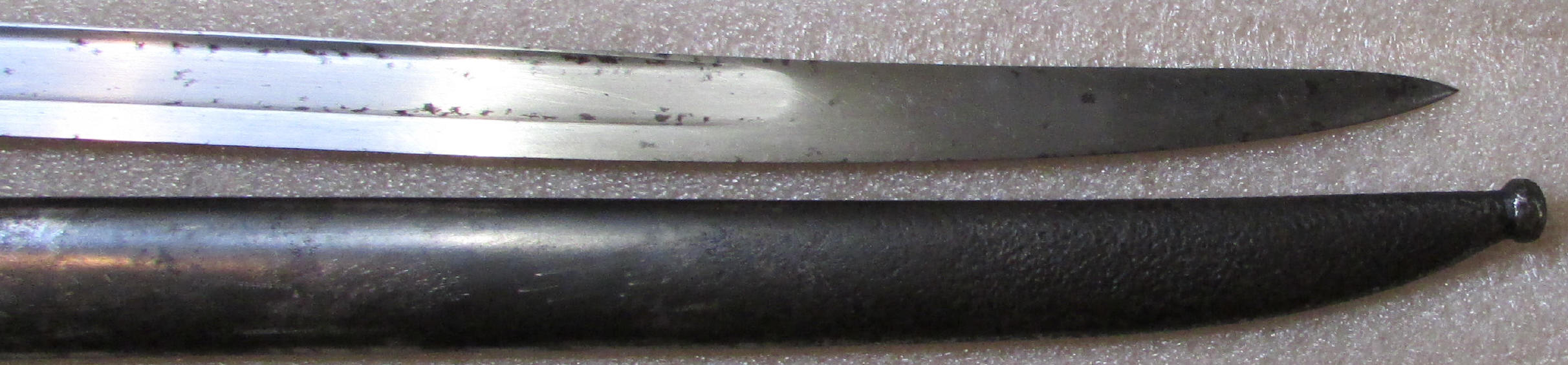 Хорошее состояние, следы бытования, немного раковин на ножнах. На клине раковин нет, темные пятна.