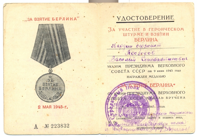 Подпись - Командир 288 Гвардейского стрелкового Кишиневского Краснознаменного полка Гв.полковник Лукьянов.