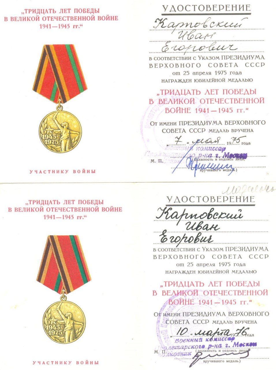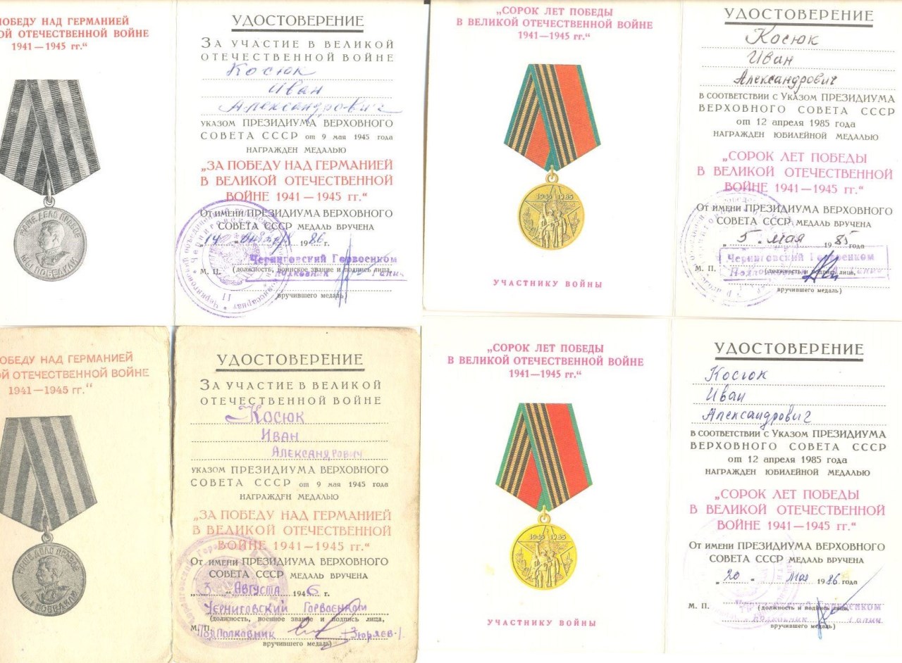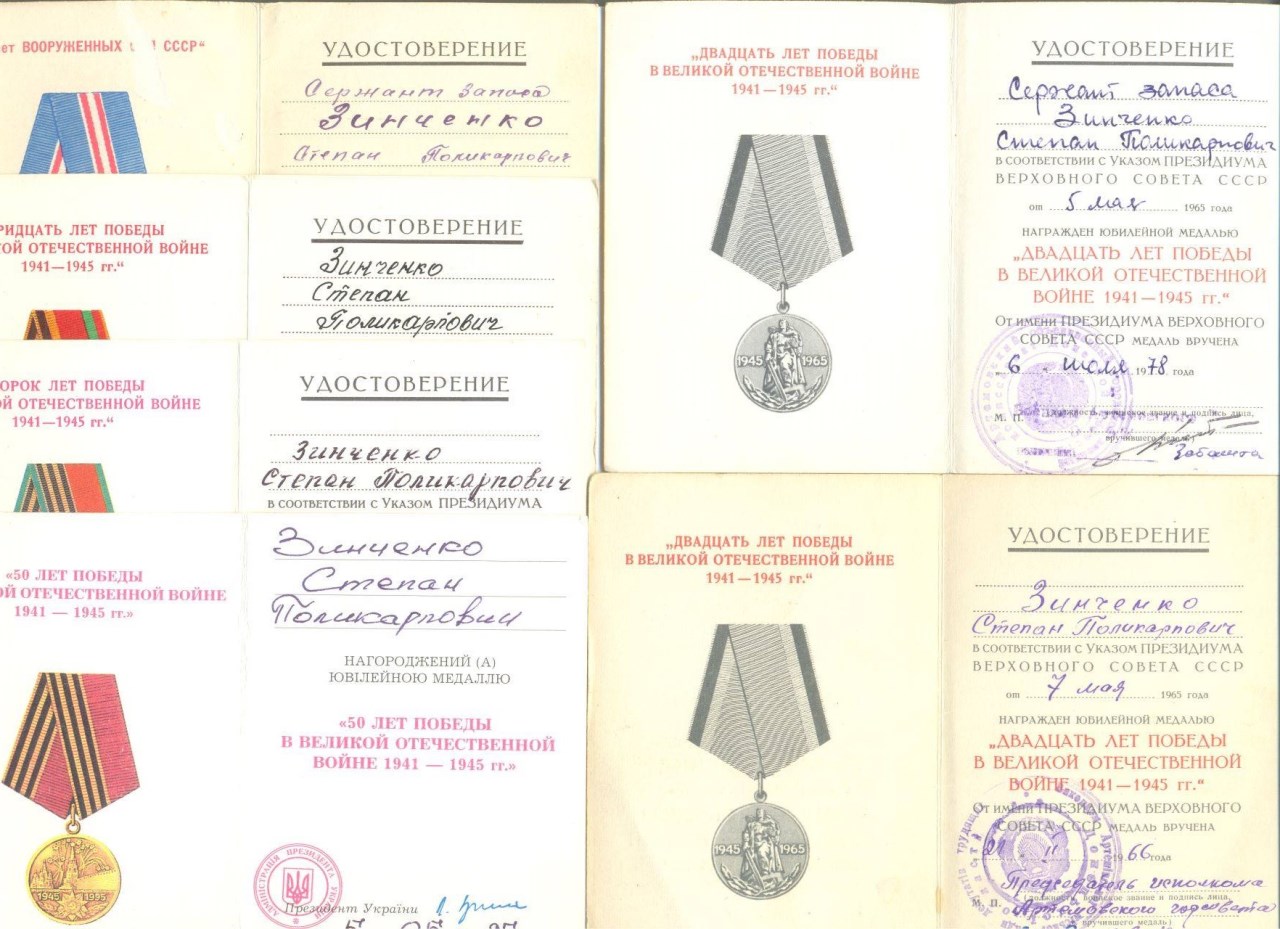 На Косюка И.А. два двойных награждения - ЗПНГ 46 года (серия "Ч") и ЗПНГ 86 года (серия "Ю"), 40 лет Победы 85-го и 86-го года вручения. Помимо "20 лет Победы" с 12-летним разрывом на Зинченко С.П. есть 30, 40, 50 лет Победы, 50, 60 ВС СССР и удостоверение на медаль Жукова на него же. Есть еще "70 лет ВС" на даму, если кому интересно - выставлю фото или скан.