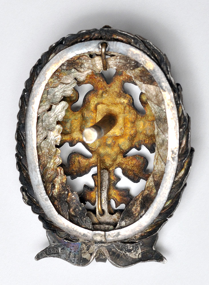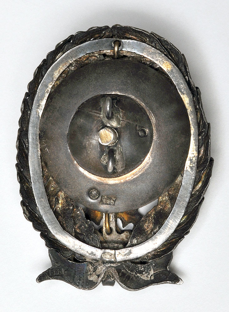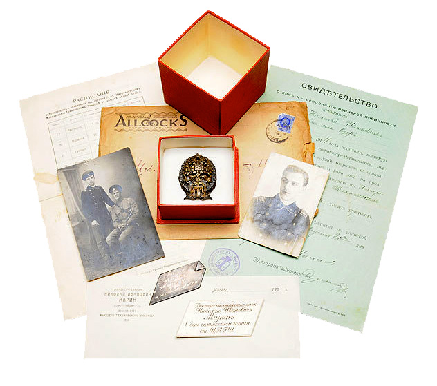 Клейма: на знаке - пробирное «84», круглое "Женская головка в кокошнике,обращенная вправо", именное «БрБ», нацарапаны инициалы владельца Николая Марина "НМ"; на закрутке - круглое "Женская головка в кокошнике,обращенная вправо"; на подложке - круглое "Женская головка в кокошнике, обращенная вправо", именное «БрБ», на оборотной стороне подложки нацарапана пометка ломбарда дата "17.VI.1922" и сумма "15.000.000"