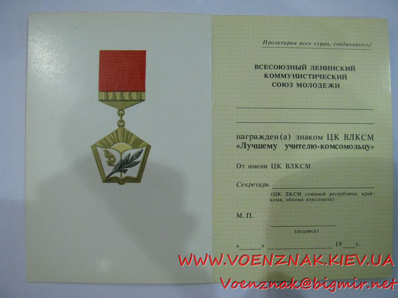 Пустое незаполненное удост-ние к знаку ЦК ВЛКСМ "Лучшему учителю-комсомольцу"
