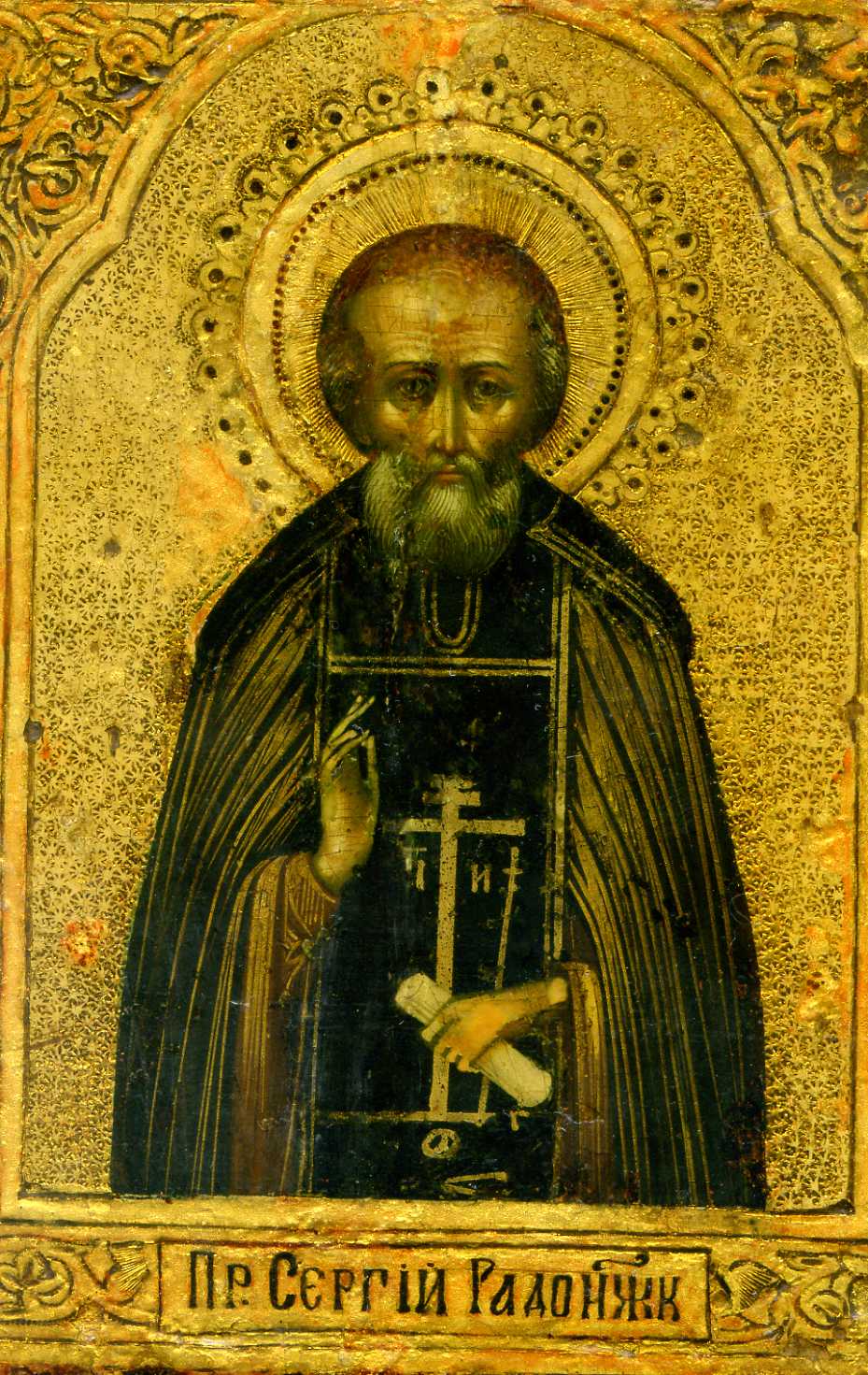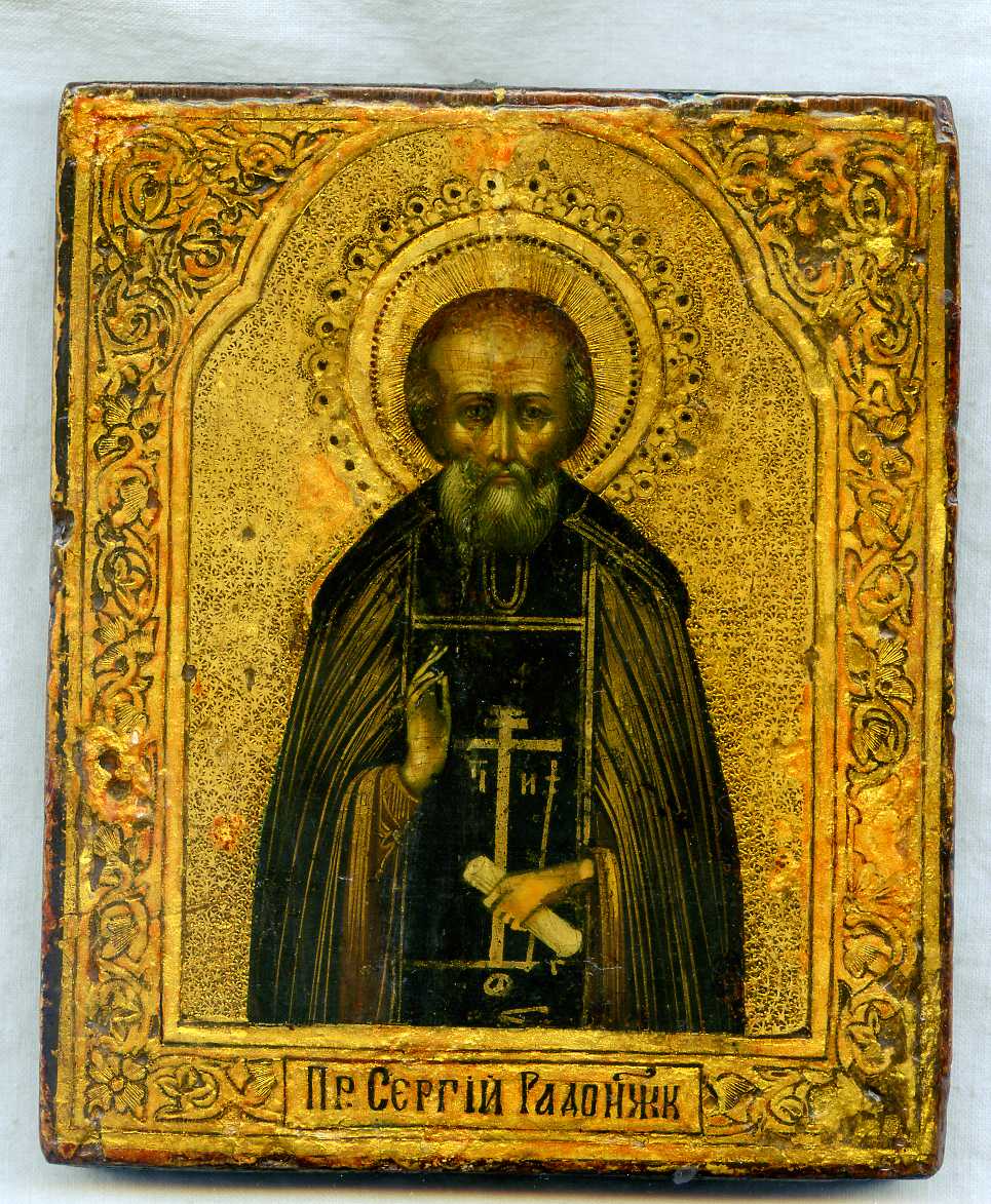 Пр. Сергий Радонжк с обратной стороны склеенная трещина, лицевая сторона вскрыта лаком.