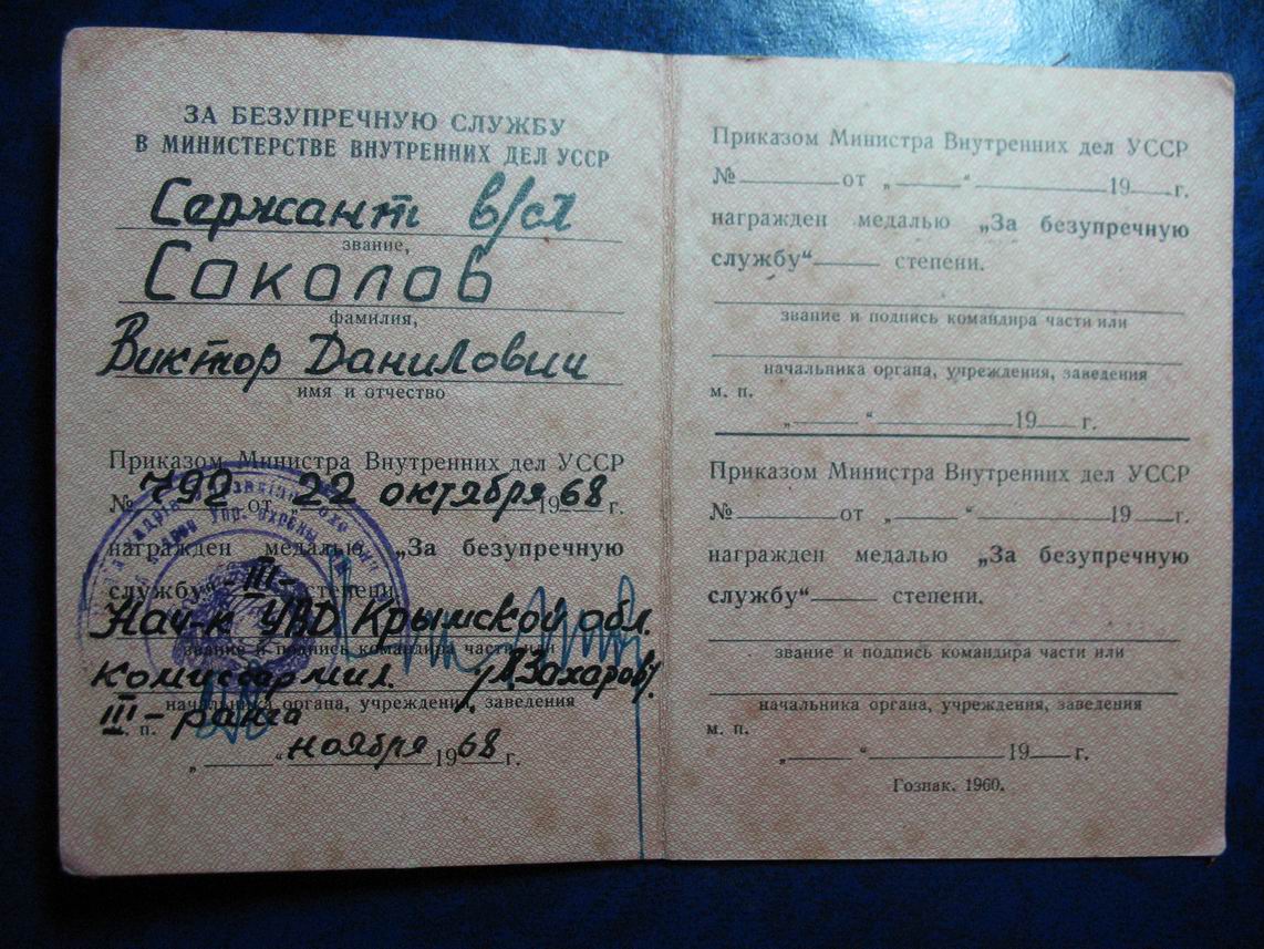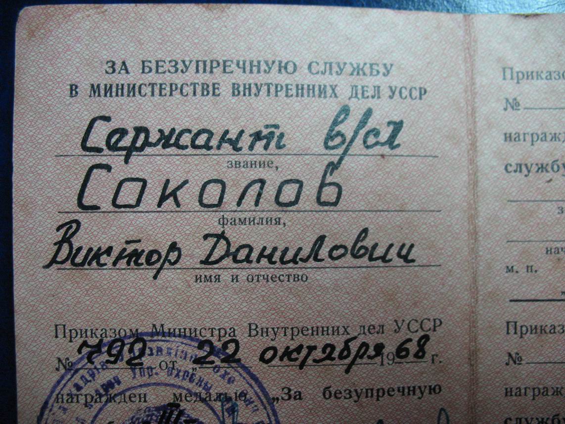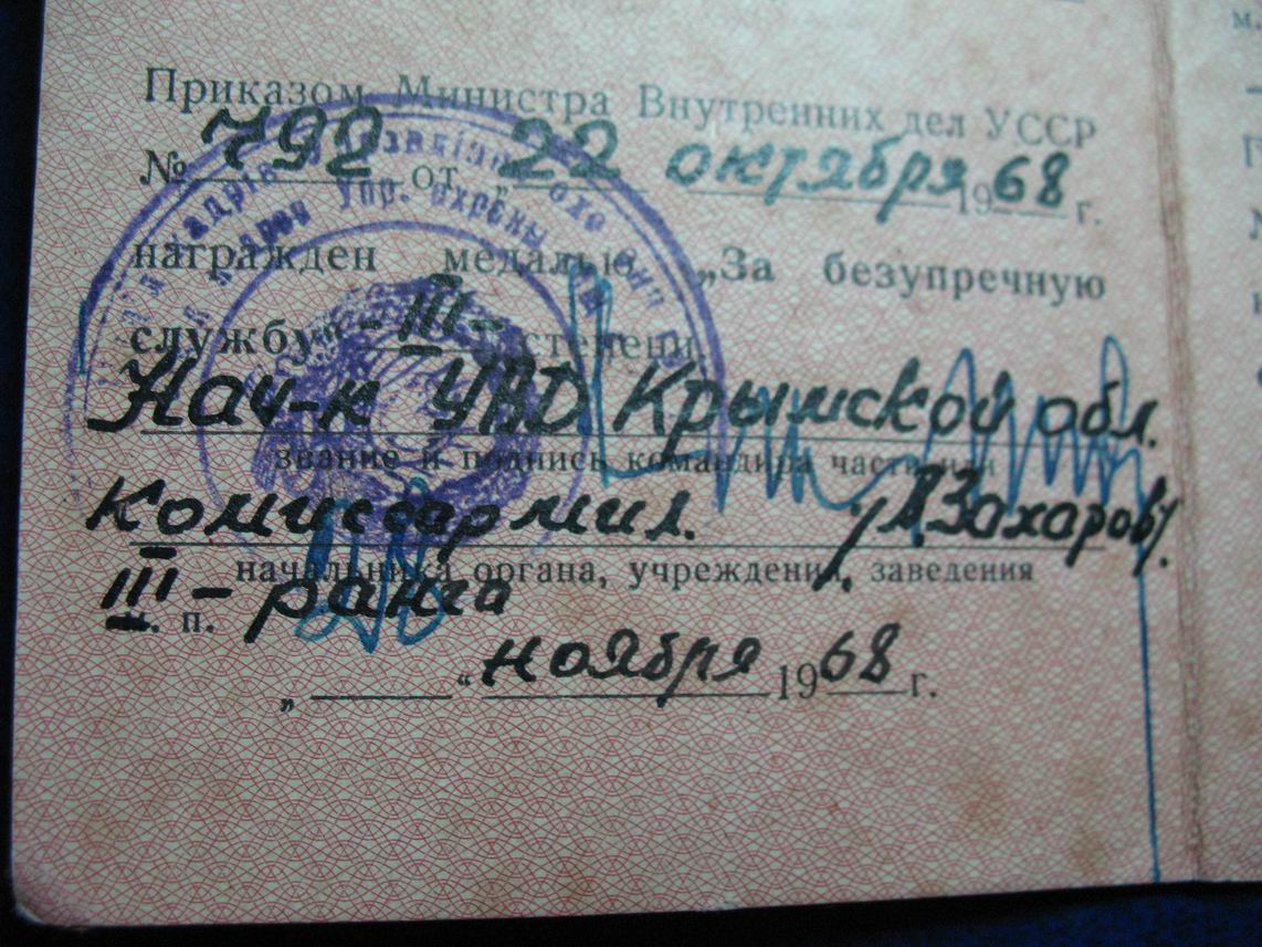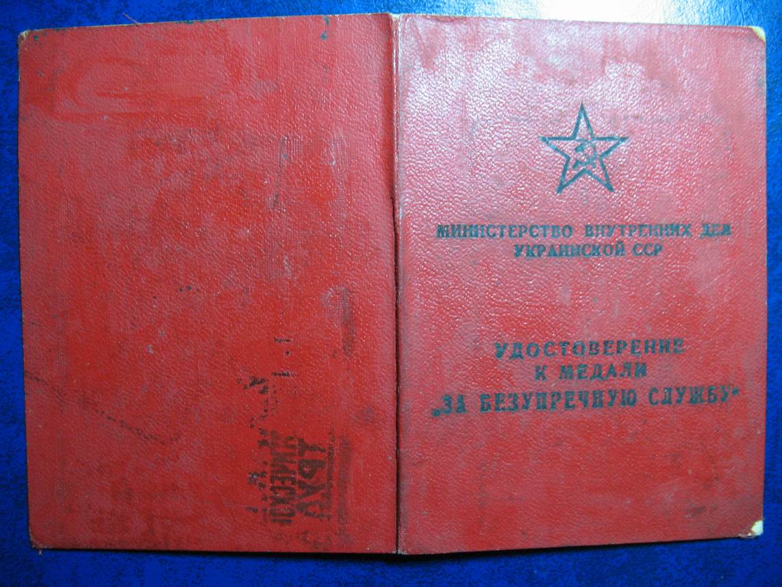 Документ к медали "За безупречную службу в МВД" Украинской ССР.