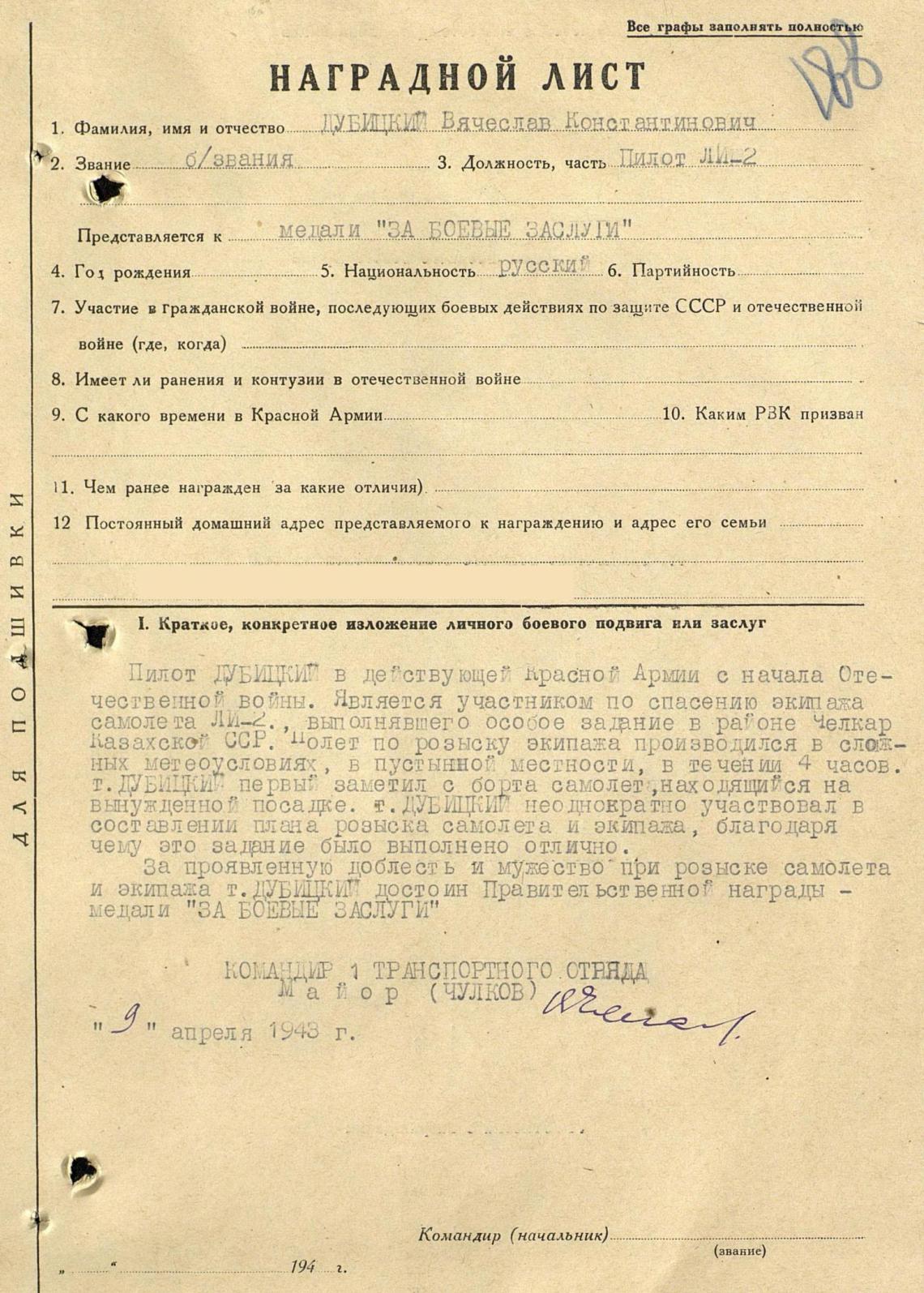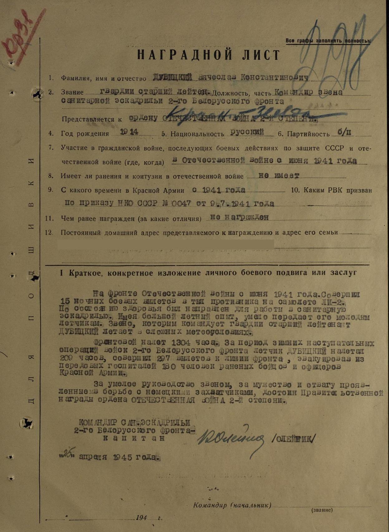 совершил 15 вылетов на ЛИ-2 за линию фронта.