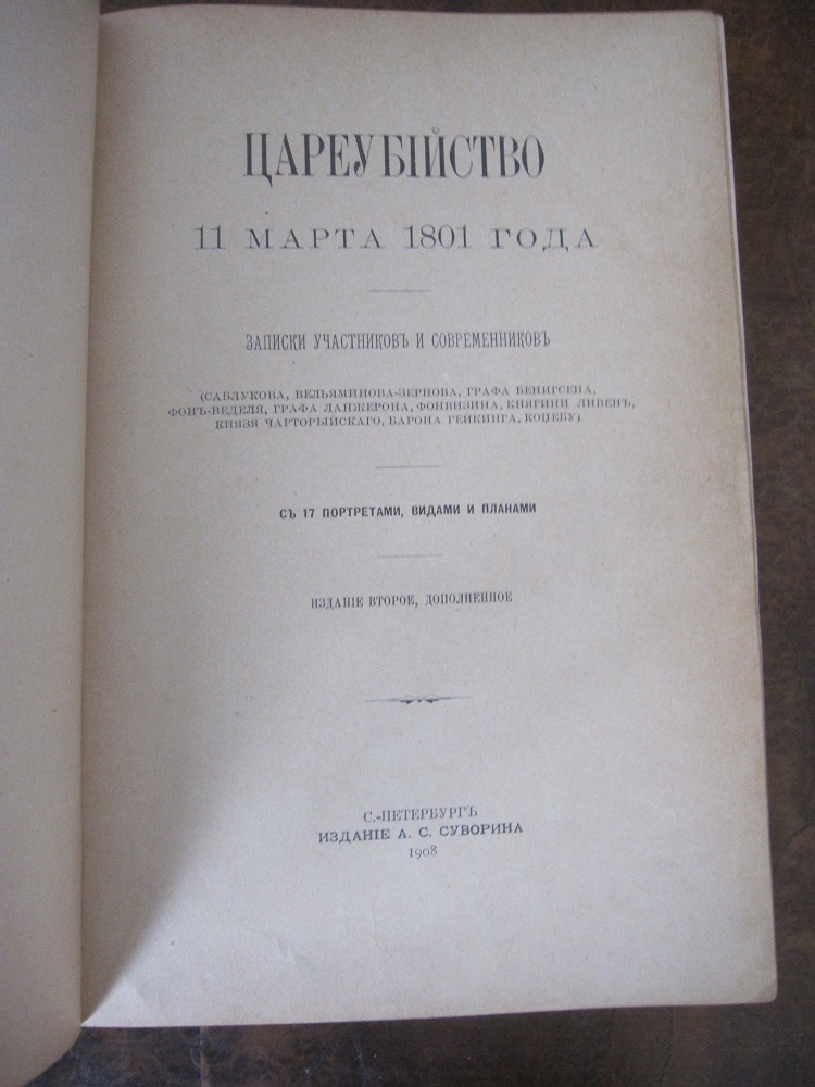 Цареубийство 11 марта 1801 г. Записки участников и современников (Саблукова, гр. Бенигсена, гр. Ланжерона, Фонвизина, княгини Ливен, кн. Чарторыйского, бар. Гейкинга, Коцебу). 2-е изд. СПб.: Изд. А.С. Суворина, 1908. , XLVIII, 458 c., 17 портретов видов и планов. 22,5 х 15,5 см. Пятна.