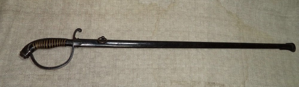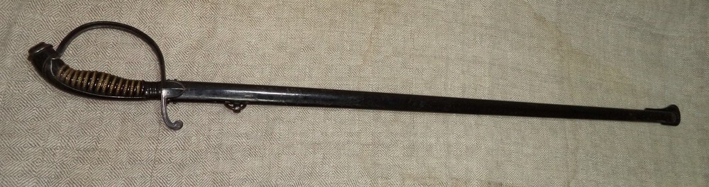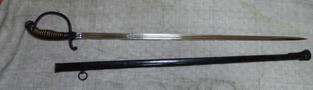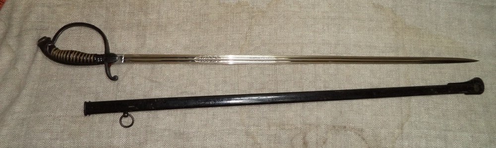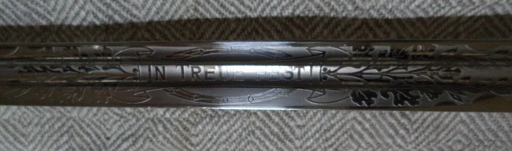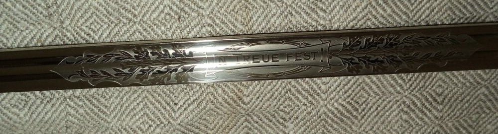 Парадная сабля баварского офицера пехоты конца XIX - начала ХХ века. Без клейм. Клинок никелированный, украшен травленым девизом "In Treue fest" (В чести сила). Металлический прибор рукояти бронзовый, Ножны металлические.