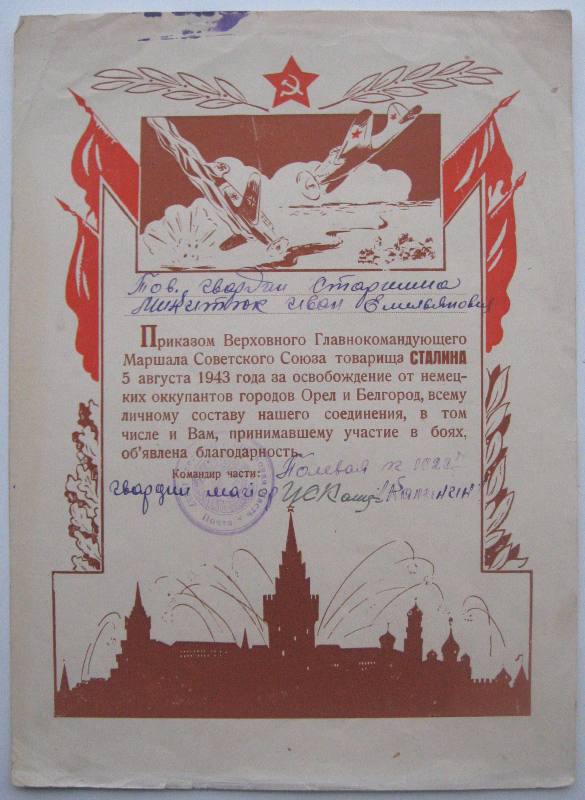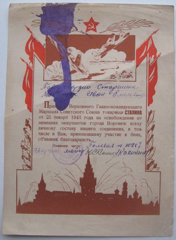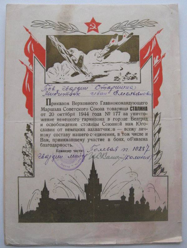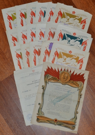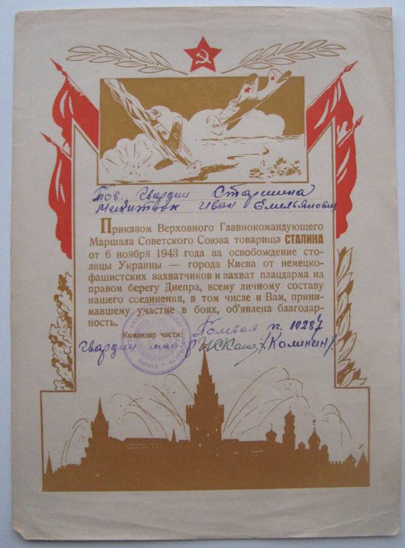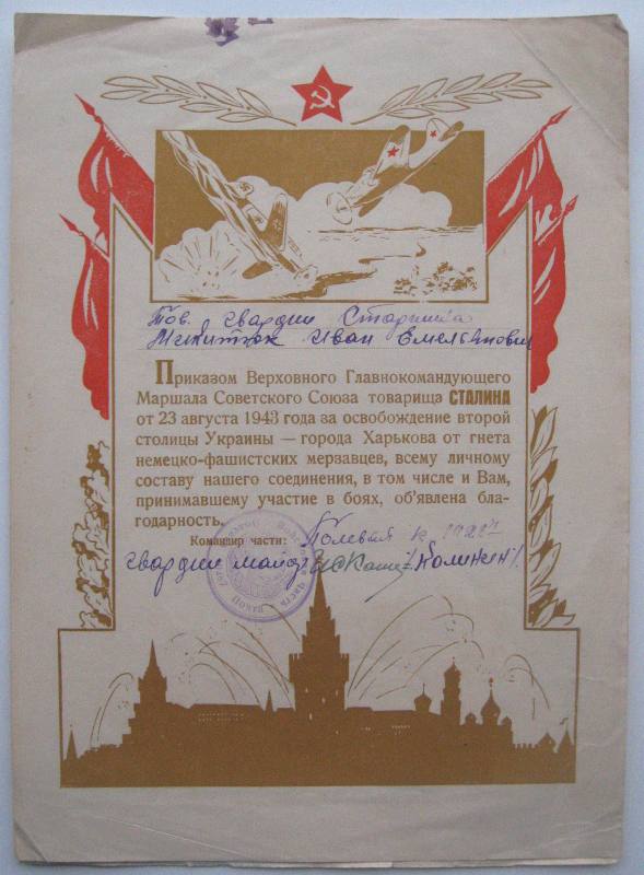 17 штук за взятие городов, ещё пару доков. Даю примеры грамот, ниже полный перечень городов. По Украине дальше Вашими путями. Предложите. 1) осв-е Киева; 2) осв-е Воронежа; 3) осв-е Орла и Белгорода; 4) осв-е Харькова; 5) 3.02.1944 осв-е городов Звенигородка, Шпола, Смела, Богуслав, Канев, и крупныхж.д. узлов Бобринская, Цветково, Мироновка; 6) осв-е Шепетовки; 7) Изяславль, Шумск, Ямполь, Острополь;