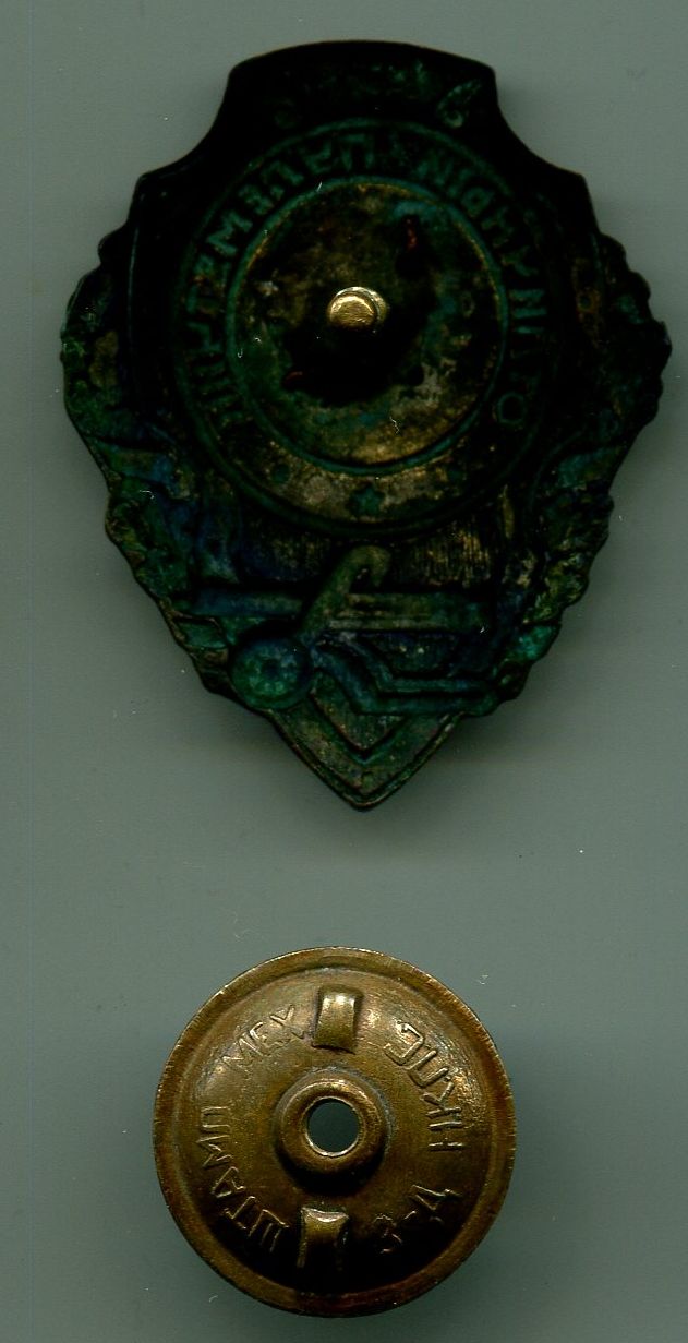 Состояние знака хорошее, сколов или чешуек нет, между молотом и ручкой серпа - потемнение под эмалью.