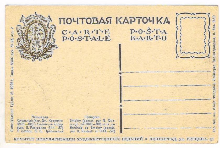 Открытка 20-х годов в хорошем коллекционном состоянии. Издательство под названием «Комитет популяризации художественных изданий» возникло при Российской академии истории материальной культуры в 1918 г. на базе существовавшего с 1896 г. издательства Общины Св. Евгении и продолжило традиции этого издательства после революции.