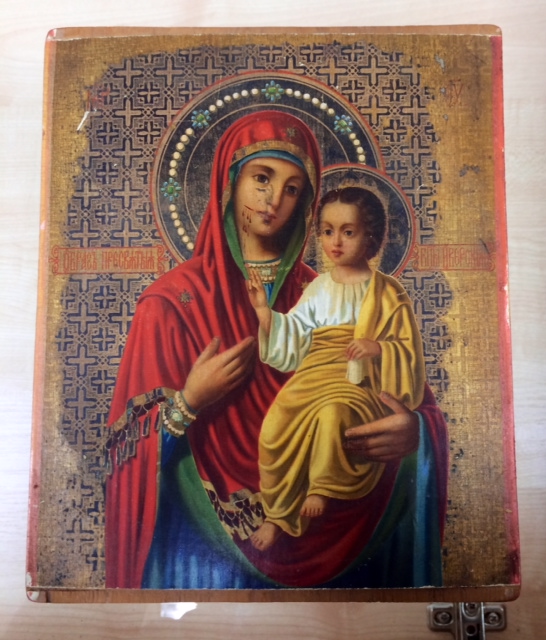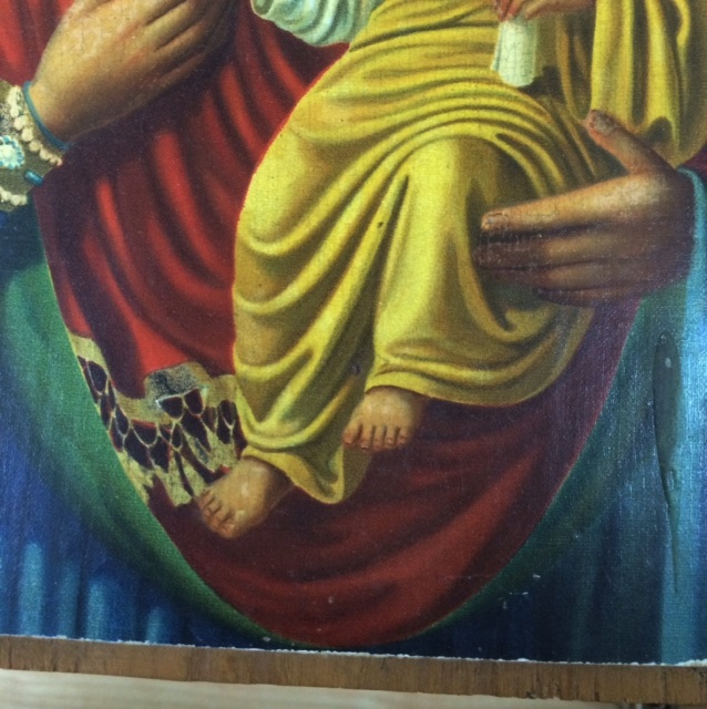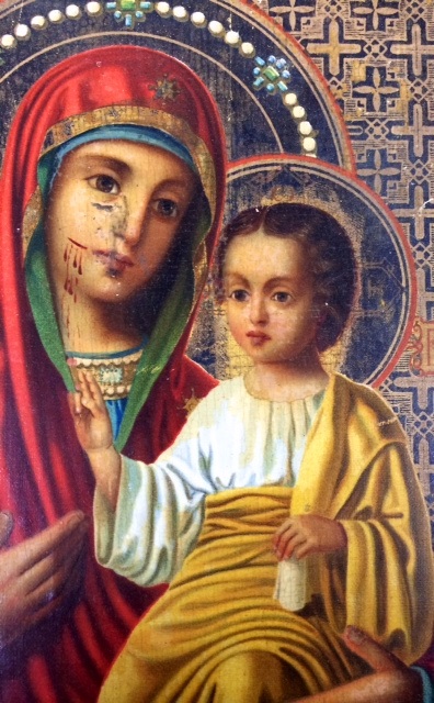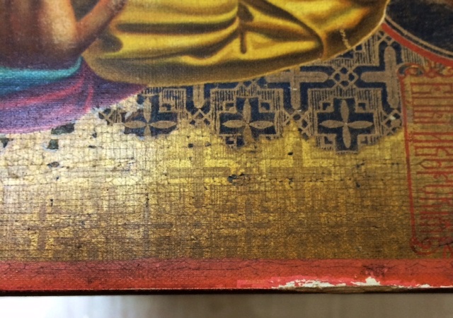 Вот такую икону сегодня взял. Слоя левкаса нет. Такое ощущение что на тонкой материи, возможно краска с изображением нанесена литографическим способом. Сделал максимальные четкие фото, чтобы разбирающиеся люди могли посмотреть.