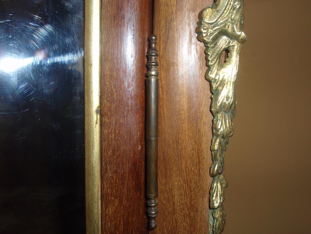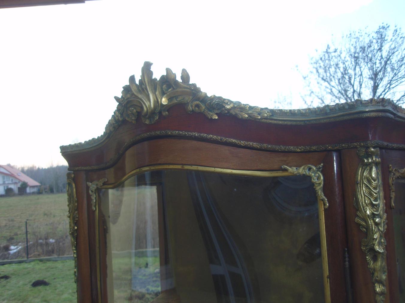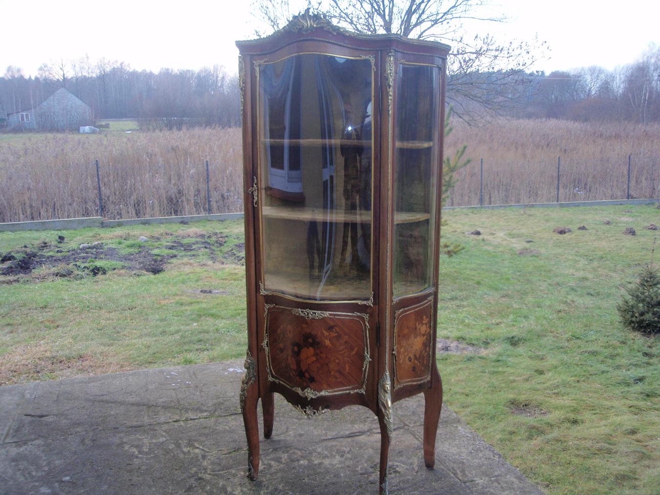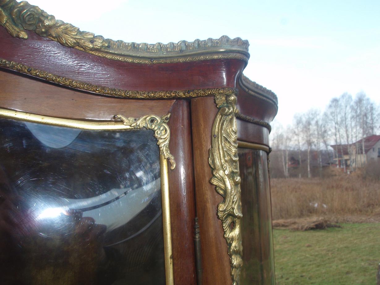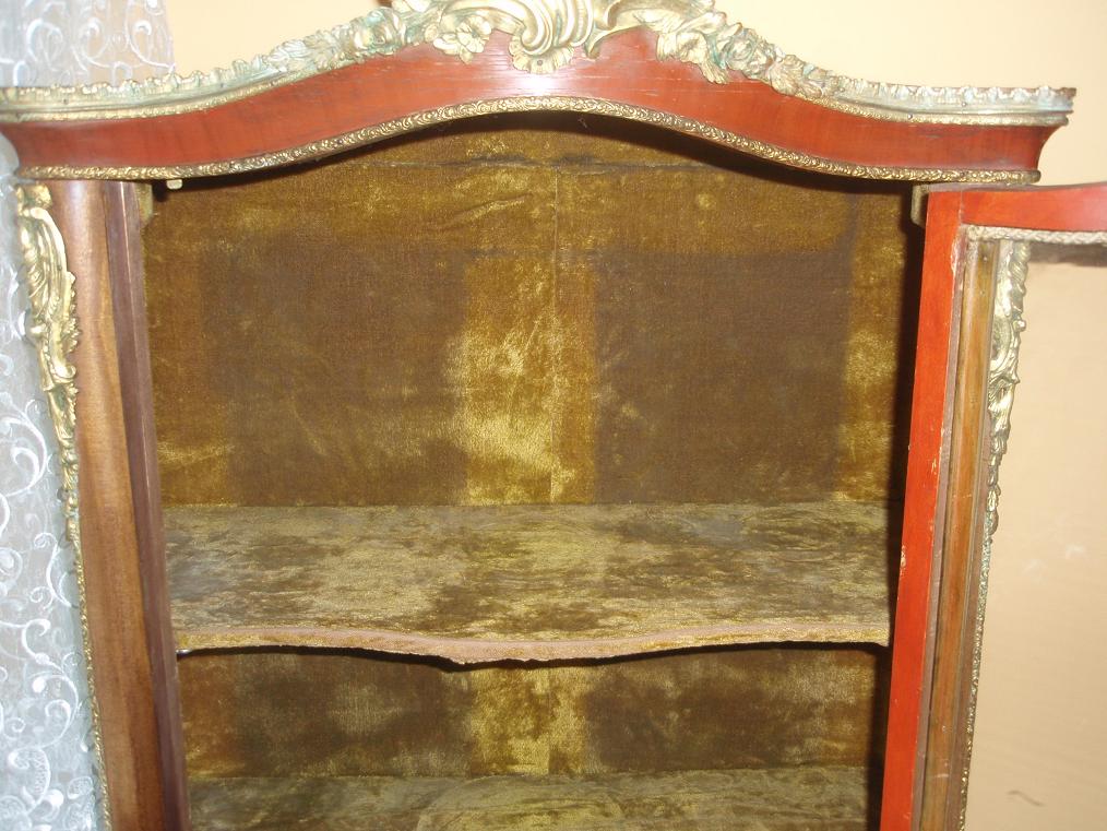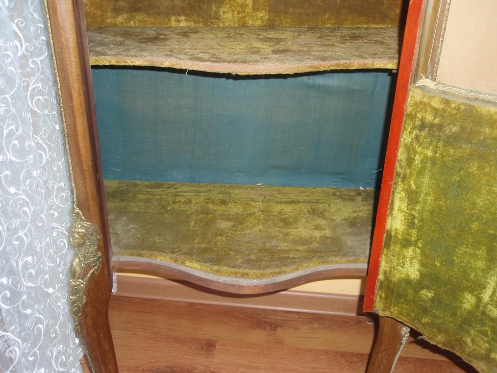 Продам витрину. НЕ подделка XX века! Выполнена в 70-ых - 80-ых годах XIX века. Предмет вымыт спиртом - минимально прополитурован шерлаком. В 20-ые года ХХ века выменена обивка внутри(в нижней части остался шелк). Внимание! Переднее стекло побили при транспортировке. Вставлен "polliuretan".Витрина в очень хорошем состоянии. Высота 170см. Цена 1900долларов+транспорт.
