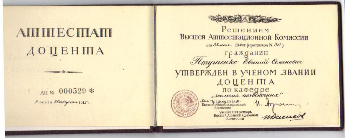 Решение ВАК 1940 г., выдан в 1945 г.