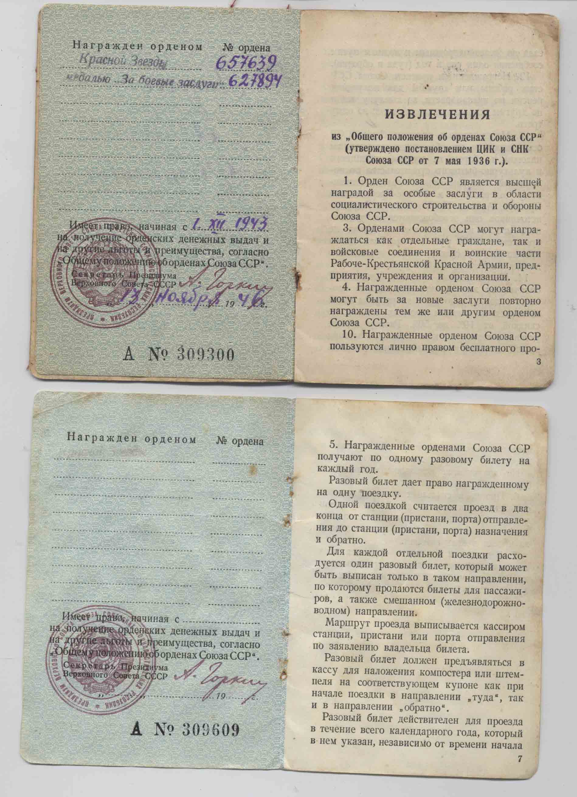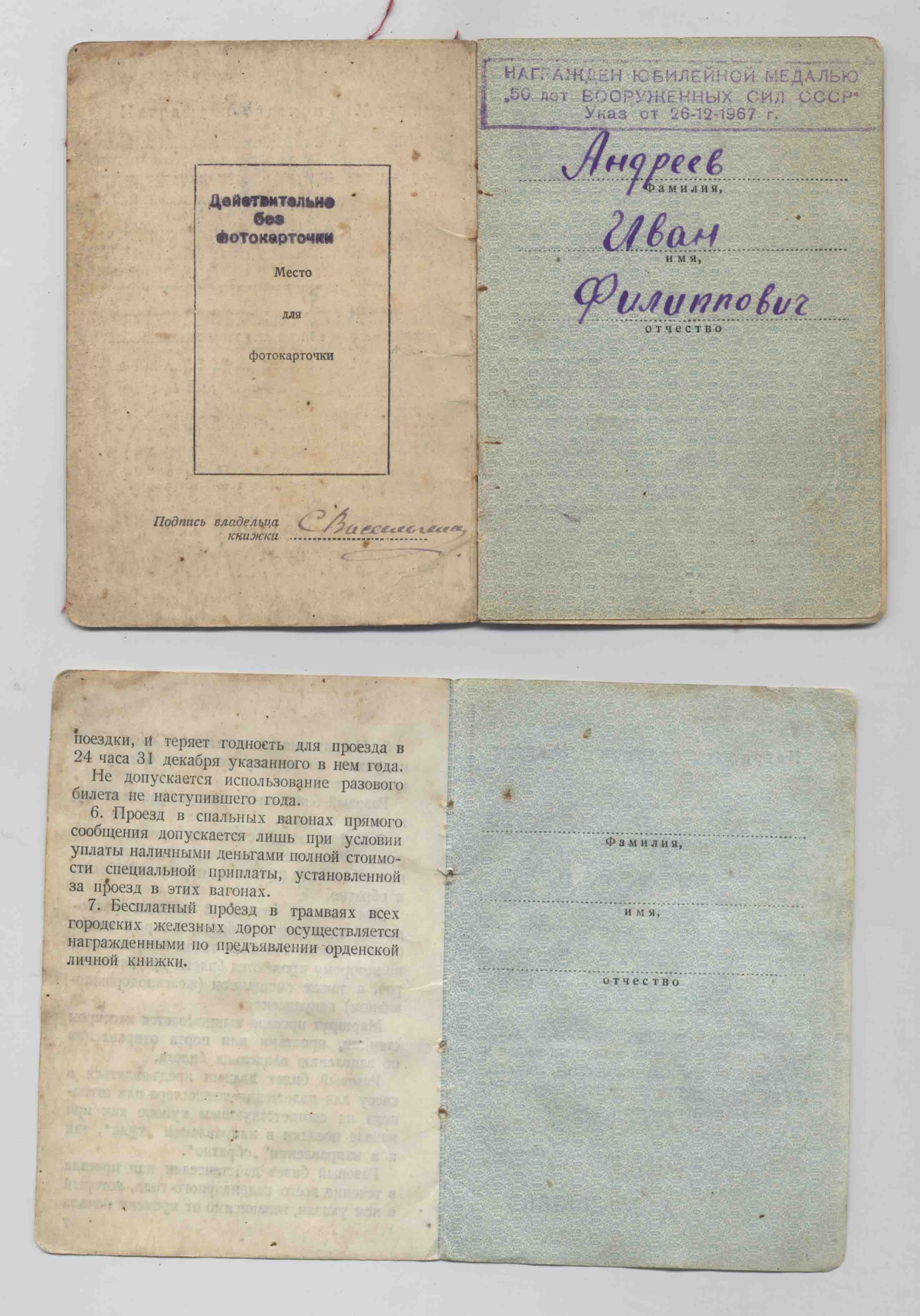 На полной книжке (КЗ 657639 и ЗБЗ 627894) интересный штамп: "Награжден юбилейной медалью 50 лет Вооруженных сил СССР. Указ от 26-12-1967 г." (первый раз такой вижу).
