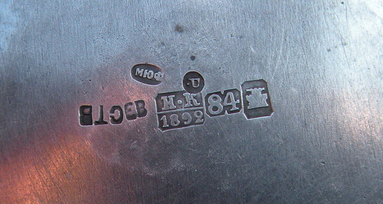 Предмет реставрирован (Р.) на Московской ювелирной фабрике (МЮФ) в период с 1927 по 1946гг. и переапробирован 875-ой метрической пробой, соответствующей 84 золотниковой, в Московской инспекции пробирного надзора.