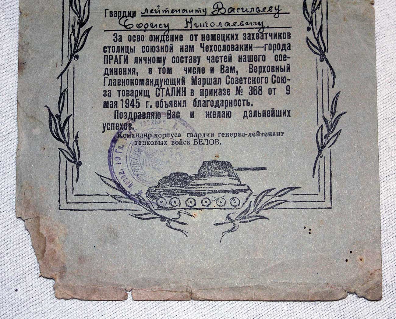 Грамота Гвардии Лейтенанту за Прагу от ком танк войск Белова