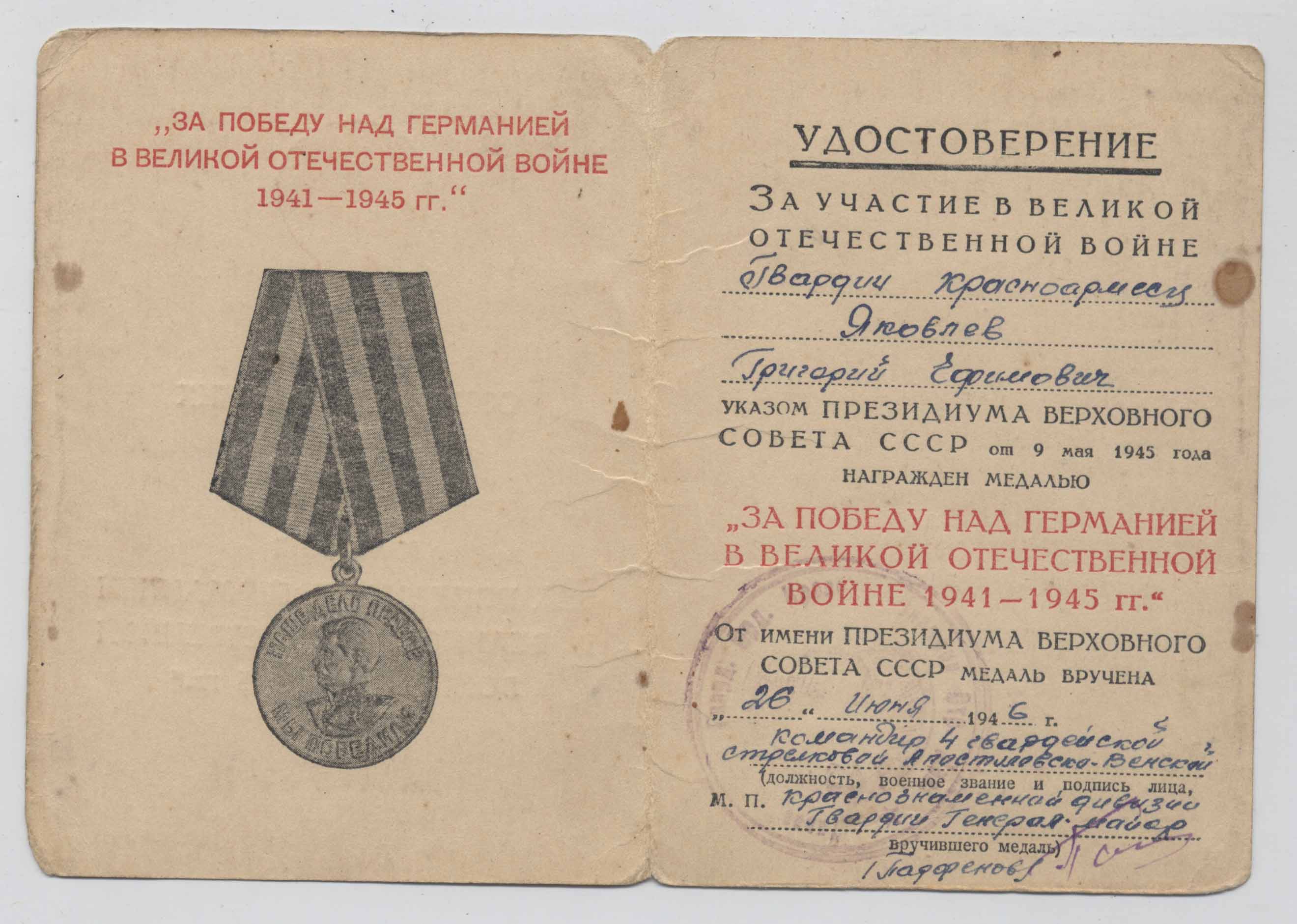 4 Гвардейская стрелковая Апостоловско-Венская Краснознаменная дивизия. Подпись ее комдива Гвардии Генерал-майора Парфенова Кузьмы Дмитриевича