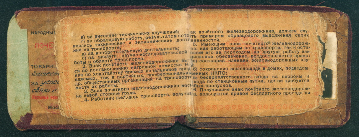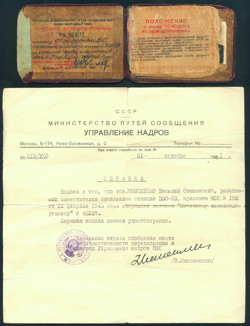 Док на Почетного ж/дорожника 1945 г. за успешные поставки фронтам + справка.