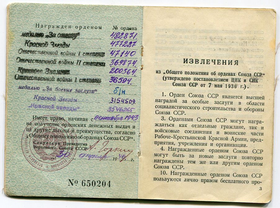 ОВ 1 степени - награждение 1945 года